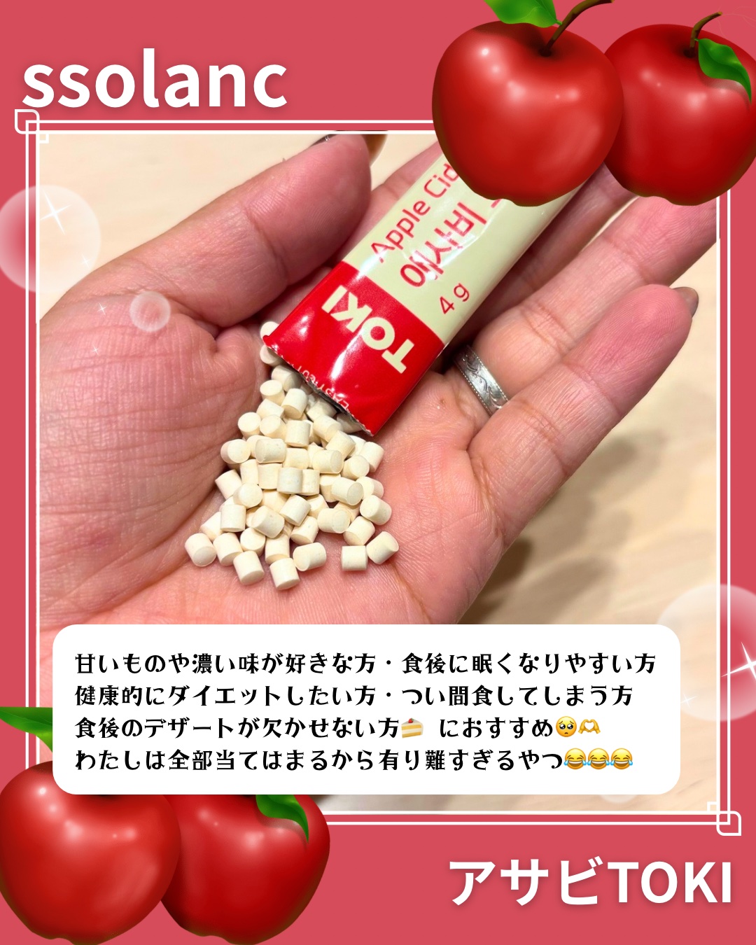 #PR@ssolanc.jp@ssolanc_officialssolanc(ソルラン)様よりご提供いただきました💛🍎<アサビTOKI>新感覚の“クランチ”タイプでそのままポリポリ食べられる、リンゴ酢ダイエットサポート✨🧡特徴ポイント👇✔1包...