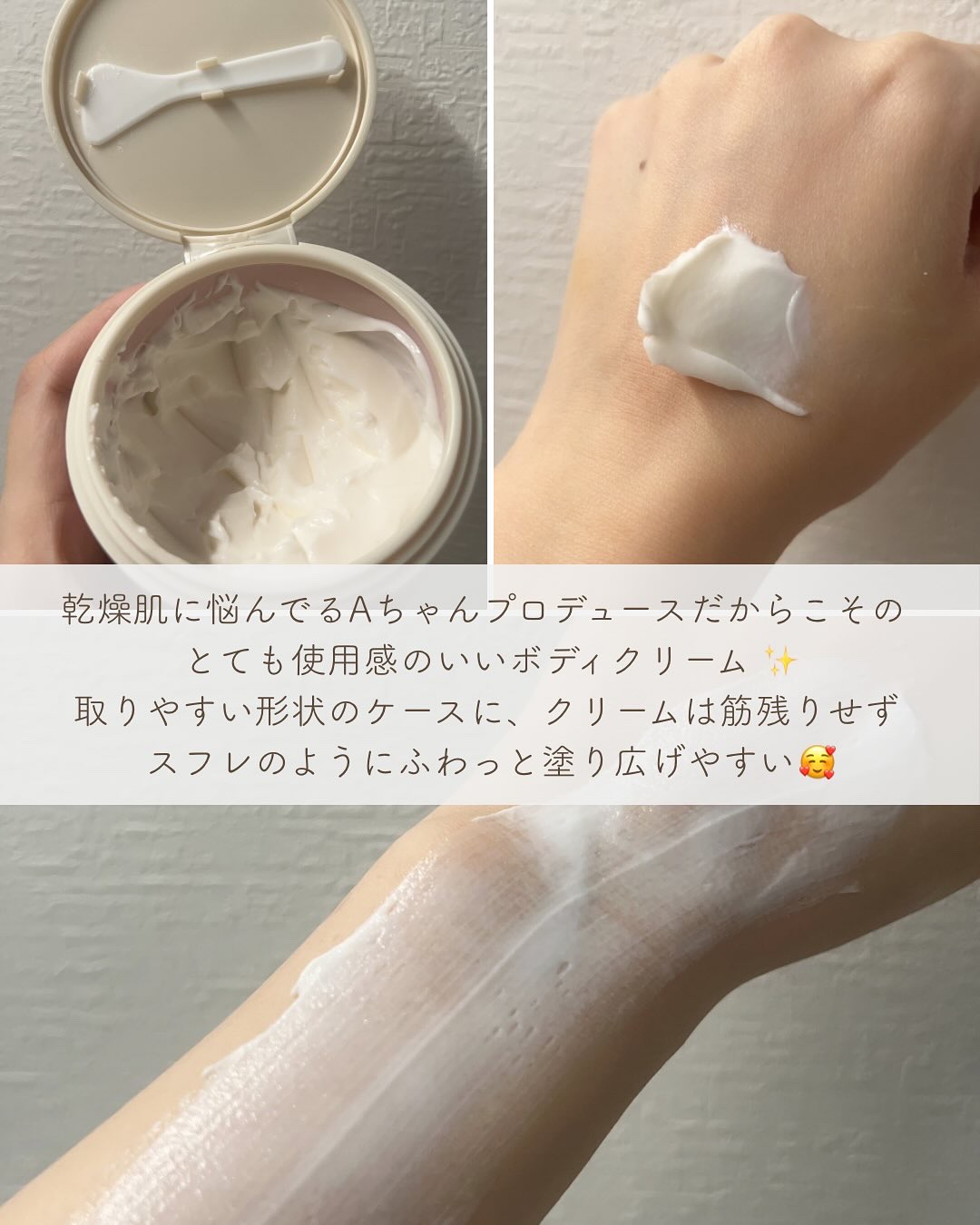 結構しっかりしたクリームなので、秋冬に使ってました。夏とかだとちょっと重いかなと思います💦 塗った後のベタつきとかはないので使用感は良かったです✨ ただ香りがかなり強くて、お風呂上がりに塗って次の日着替える時にまだ香るので苦手な方は向いてないかなと思います。