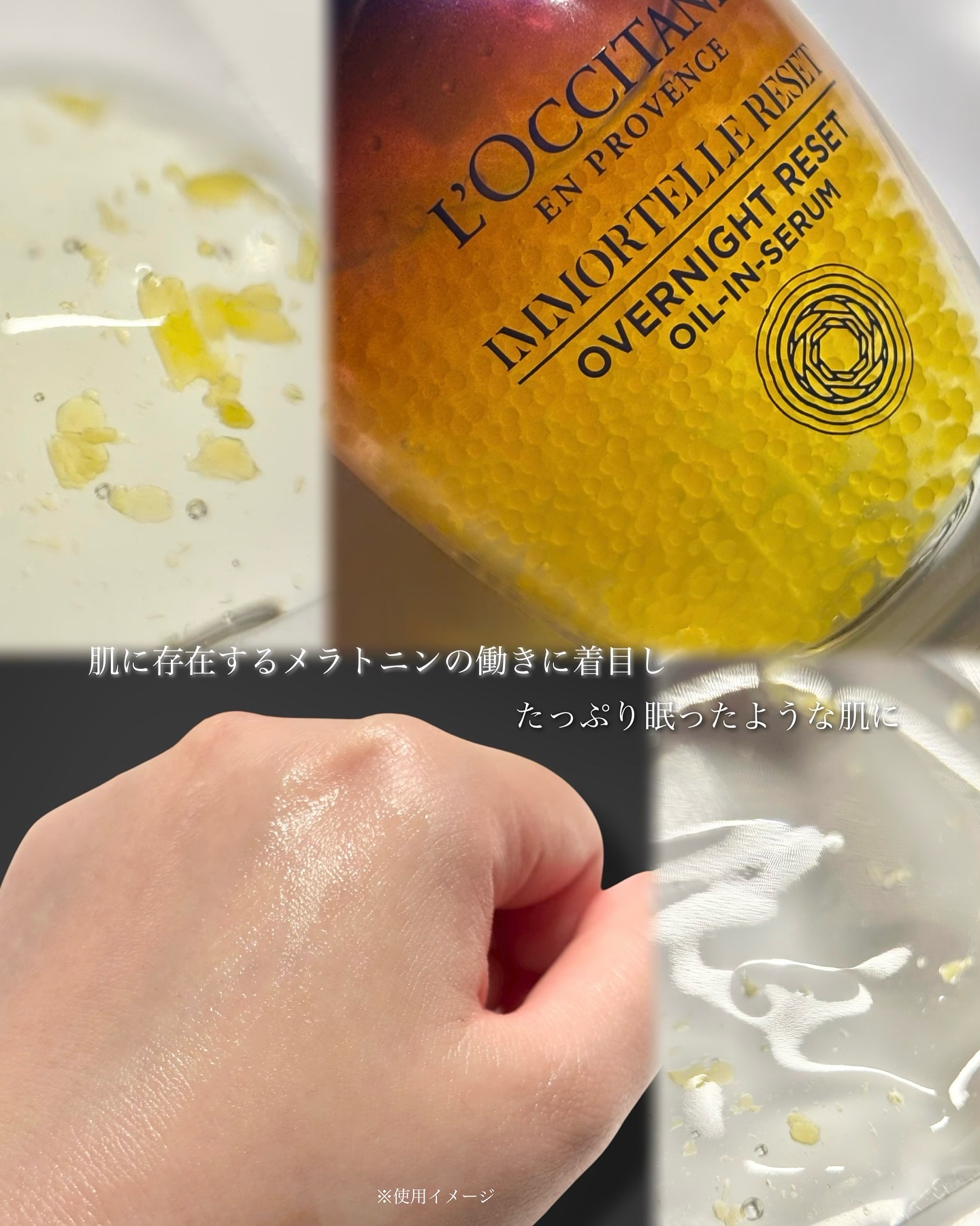 ロクシタンから商品提供をいただきました。◇L'OCCITANEイモーテルオーバーナイトリセットセラム永久花(イモーテル)のエッセンシャルオイルをカプセルに閉じ込めた夜用美容液。肌にのせた瞬間、カプセルが弾けてフレッシュに混ざり、眠っている間に...