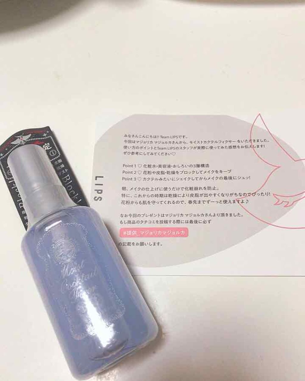 MAJOLICAMAJORCAモイストカクテルフィクサーEX【使った商品】モイストカクテルフィクサーEX【商品の特徴】¥1,320円(税込)60ml化粧水状おしろい(仕上げ用)【使用感】2層式で振るタイプのミストビシャってかかるが割と細かく馴...