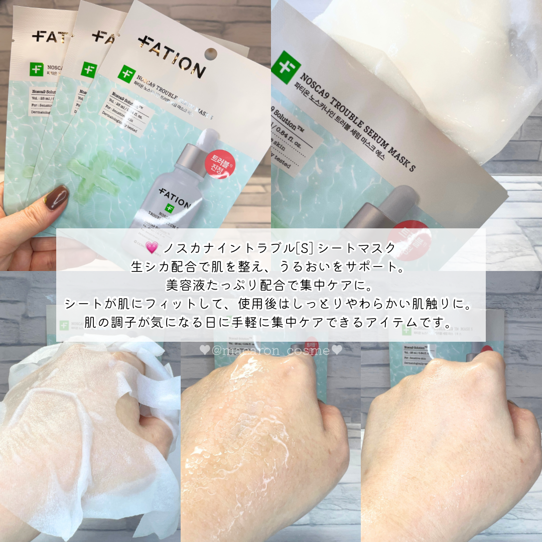 FATION◻ノスカナイントラブルセラムS◻ノスカナイントラブルセラムマスクSFATIONは、90年以上の歴史を持つ韓国の大手製薬会社「東亜製薬」が9年かけて研究・開発し、敏感肌のために誕生した“ダーマソリューションスキンケアブランド”。୨୧...