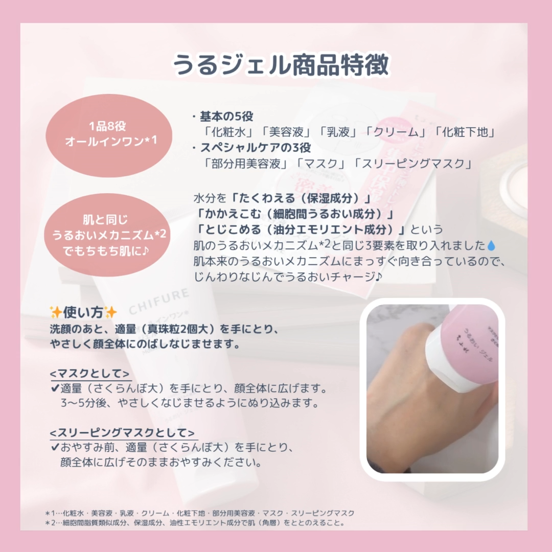 - ●新提案!ストレスフリーで理想のもちもち肌を手に入れる “うるジェルマスク”マスク使いにもうれしい大容量チューブタイプ。 ●【限定・大容量チューブタイプ】シリーズ*1累計出荷数3,000万個*2を突破したちふれのオールインワンからうるジェル大容量チューブタイプが登場。 150gのたっぷりサイズで、毎日のケアはもちろん、マスク使いにもおすすめです。 (*1 ちふれ うるおいジェル(本体・詰替用・大容量チューブタイプ)、ちふれ 美白うるおいジェル(本体・詰替用)、ちふれ 薬用リンクルジェルクリーム(本体・詰替用)計7種 *2 2013年8月20日から2025年1月31日までの累計出荷個数(株式会社ちふれ化粧品調べ)) ●【1品で8つの役割】化粧水・美容液・乳液・クリーム・化粧下地の基本5役と、部分用美容液・マスク・スリーピングマスクのスペシャルケア3役を兼ね備えたオールインワンジェルです。 ●【水分たっぷりジェルマスク発想】うるジェルは “クッション性” と “のびやすさ“ にこだわった ”水分たっぷりジェル”でしっかりうるおいを密封するから、マスクとして使用するのがおすすめ!べたつかず、もっちりとした使用感で、不快感なくマスク使いが可能です。 ●【簡単3STEPでスキンケア完了】うるジェルマスクは、簡単3STEPでスキンケアが完了。目や口の際など顔全体を余すことなくぴったりフィットします。 ●【忙しい⽅にも嬉しい“ながらマスク”】家事やスマホ操作中でも使える“ながらマスク”に最適!ズレたり落ちたりする心配がなく、顔認証もへっちゃらです。 ●【保湿成分配合】うるおいをキープする4種の保湿成分*3と肌への密着を高める2つの成分*4を配合。マスクとして使えば水分保持力アップ*5します。(*3 ラウロイルグルタミン酸ジ(フィトステリル/オクチルドデシル)、ダイマージリノール酸(フィトステリル/イソステアリル/セチル/ステアリル/ベヘニル)、ポリクオタニウム-51、ヒアルロン酸Na *4 ポリクオタニウム-51、ダイマージリノール酸 *5 通常の使い方との比較、塗布後2時間後に測定、自社調べ、水分量測定器のスコアの変化量) ●無香料、無着色、アルコールフリー、酸化亜鉛フリー ●保湿成分:ヒアルロン酸・トレハロース配合 ●内容量:150g
