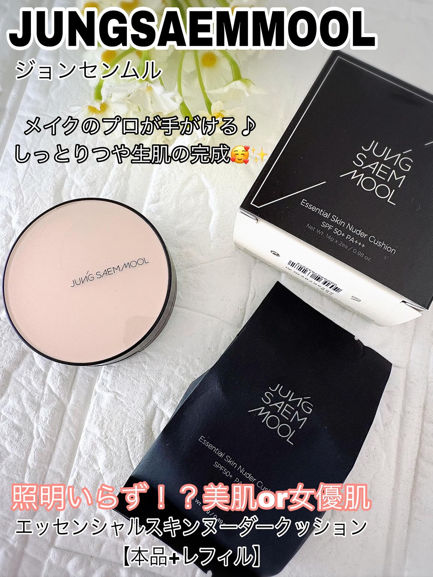 ジョンセンムルのエッセンシャルスキンヌーダークッション(フェアライト)💫まずびっくりしたのが、ツヤの美しさ!✨厚塗り感がなくて、まるで素肌そのものがキレイに見えるような自然なツヤ感💎モイスチャーフィットテクスチャーでしっとり伸びるのに軽く、乾...