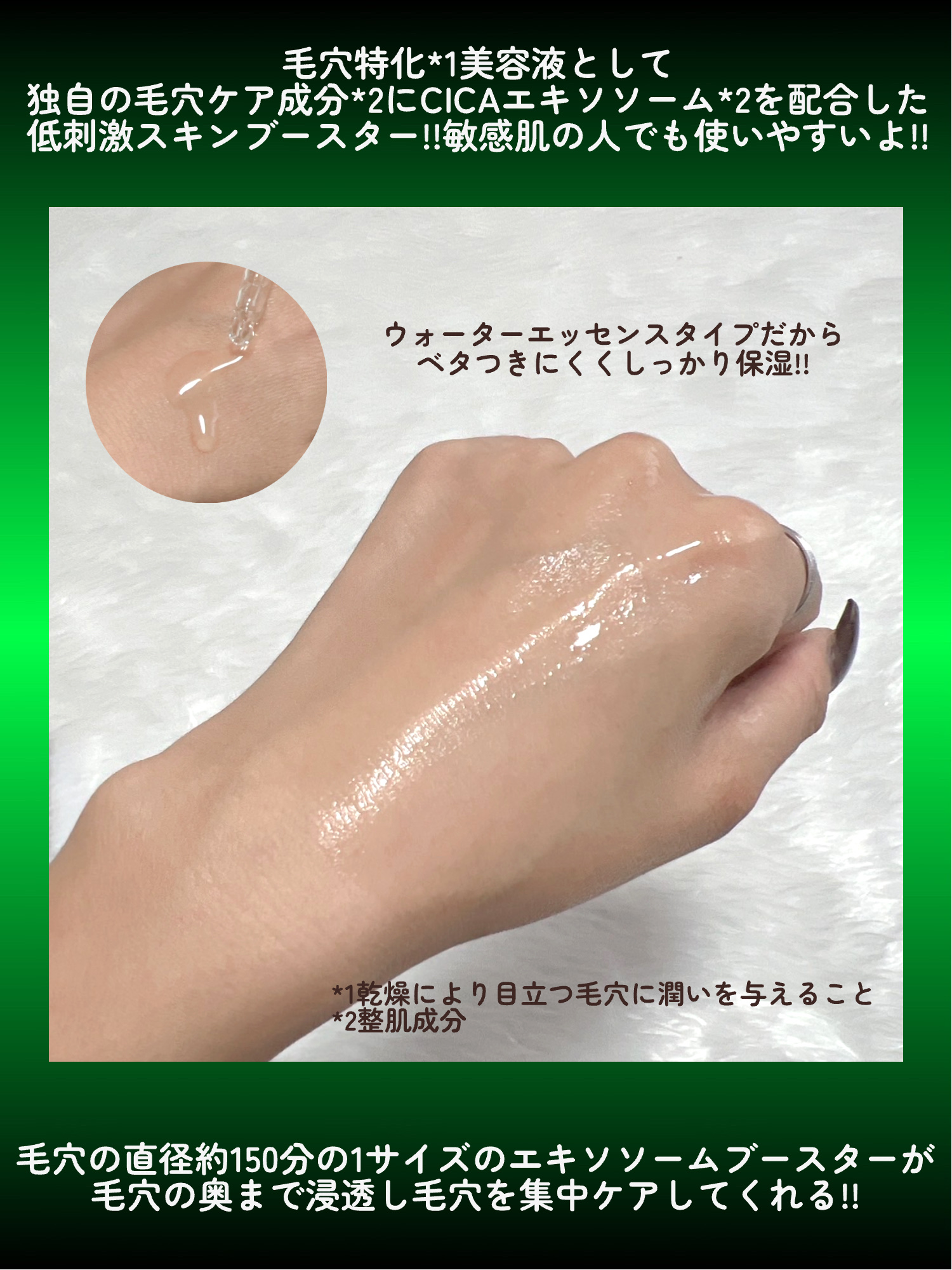 - ポアタイトニング ブーストセラムは、毛穴特化*1セラムとして、独自の毛穴ケア成分*2にCICAエキソソーム*2を配合した低刺激スキンブースターで、敏感肌の方でもご使用いただけます。テクスチャーはべたつかず、さっぱりとした仕上がりのウォーターエッセンスタイプなので、寝る前のスキンケアはもちろん、化粧前のブースターとしてもご使用いただけるセラムです。 *1乾燥により目立つ毛穴に潤いを与えること *2整肌成分