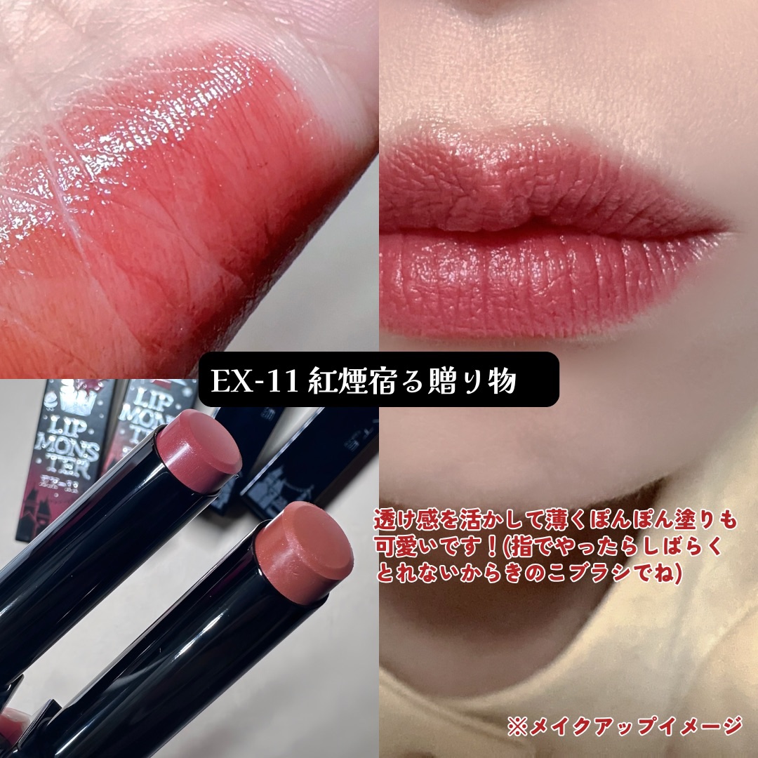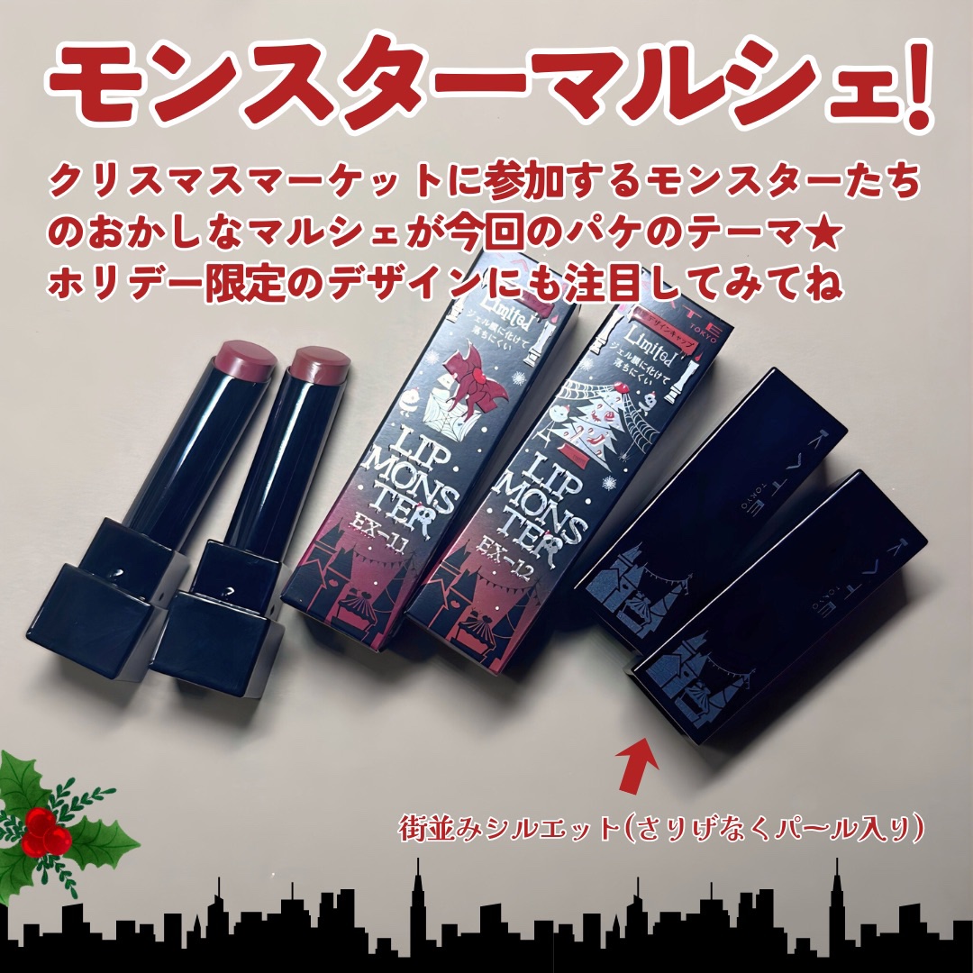 - 落ちにくさも美発色もよくばりたい、つけたての色が長時間持続する人気の口紅リップモンスター。 唇から蒸発する水分を活用して密着ジェル膜に変化する独自技術※で、つけたての色が長時間持続。 高発色&保湿。 ※当社独自の色持ち技術 ■花火のようにまぶしくきらめく 繊細なラメが際立つ限定色 EX-6 ピンクカラー×青ラメ【ロケット花火流星群】 EX-7 オレンジカラー×黄&緑ラメ【100万発の線香花火】 EX-8 レッドカラー×緑ラメ【打ち上げ花火ブランコ】 ■深みレッド系カラーの限定色 EX-9 戦慄の喜笑 (限定色) EX-10 狂気の怒号 (限定色) 【2025クリスマスコフレ】 落ちにくいリップモンスターから、唇の血色感を底上げする ホリデーシーズン限定の熱感ニュアンスベージュ系カラー登場。 EX-11 紅煙宿る贈り物(限定色):ボルドーベージュ系 EX-12 盗まれた1224mの星光(限定色):キャメルベージュ系