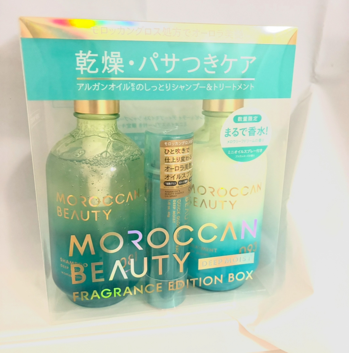 商品詳細情報モロッカンビューティ ディープモイストシャンプー&ヘアトリートメント ミニオイルスプレー付き 限定キット(メロウリーフドリームの香り)