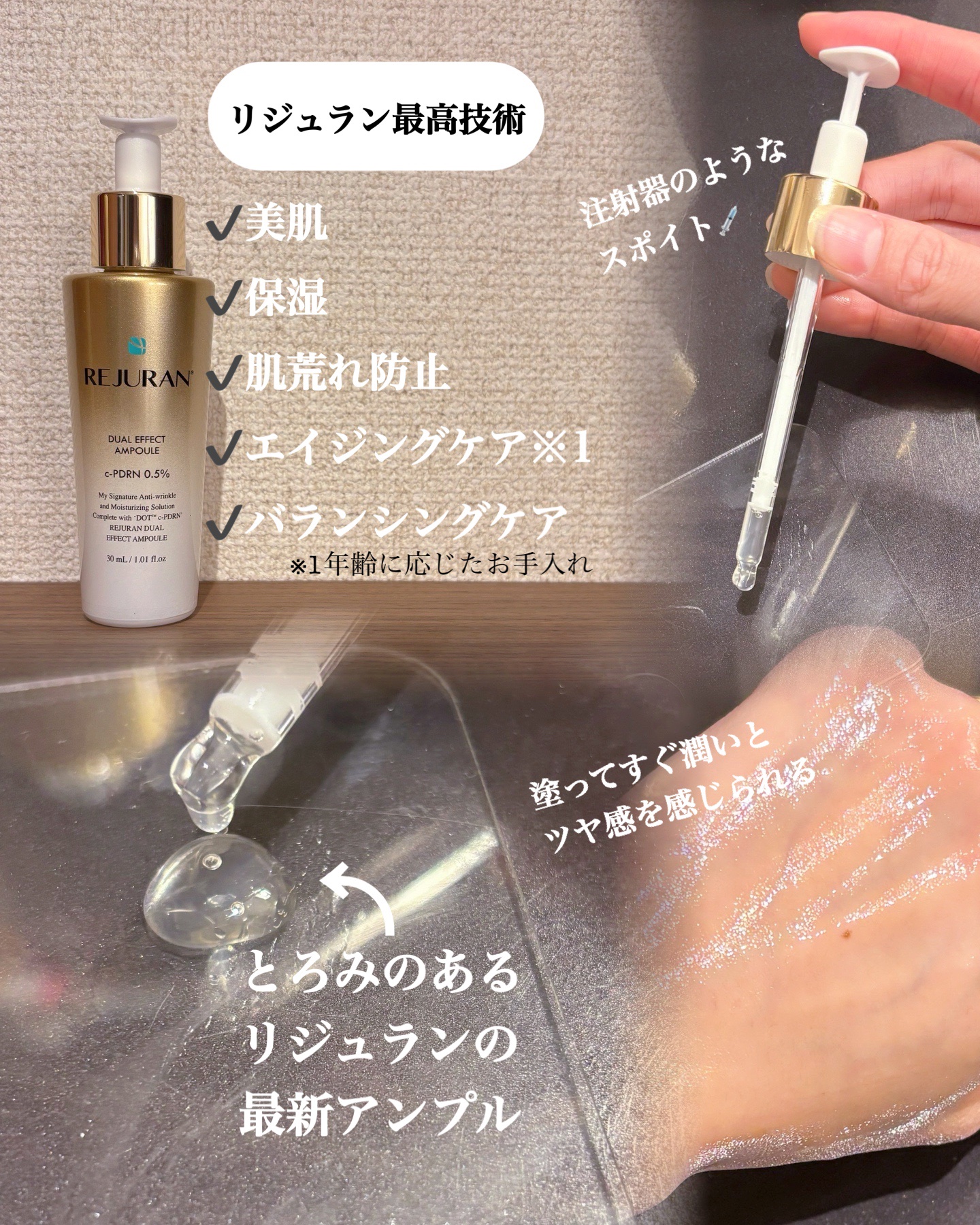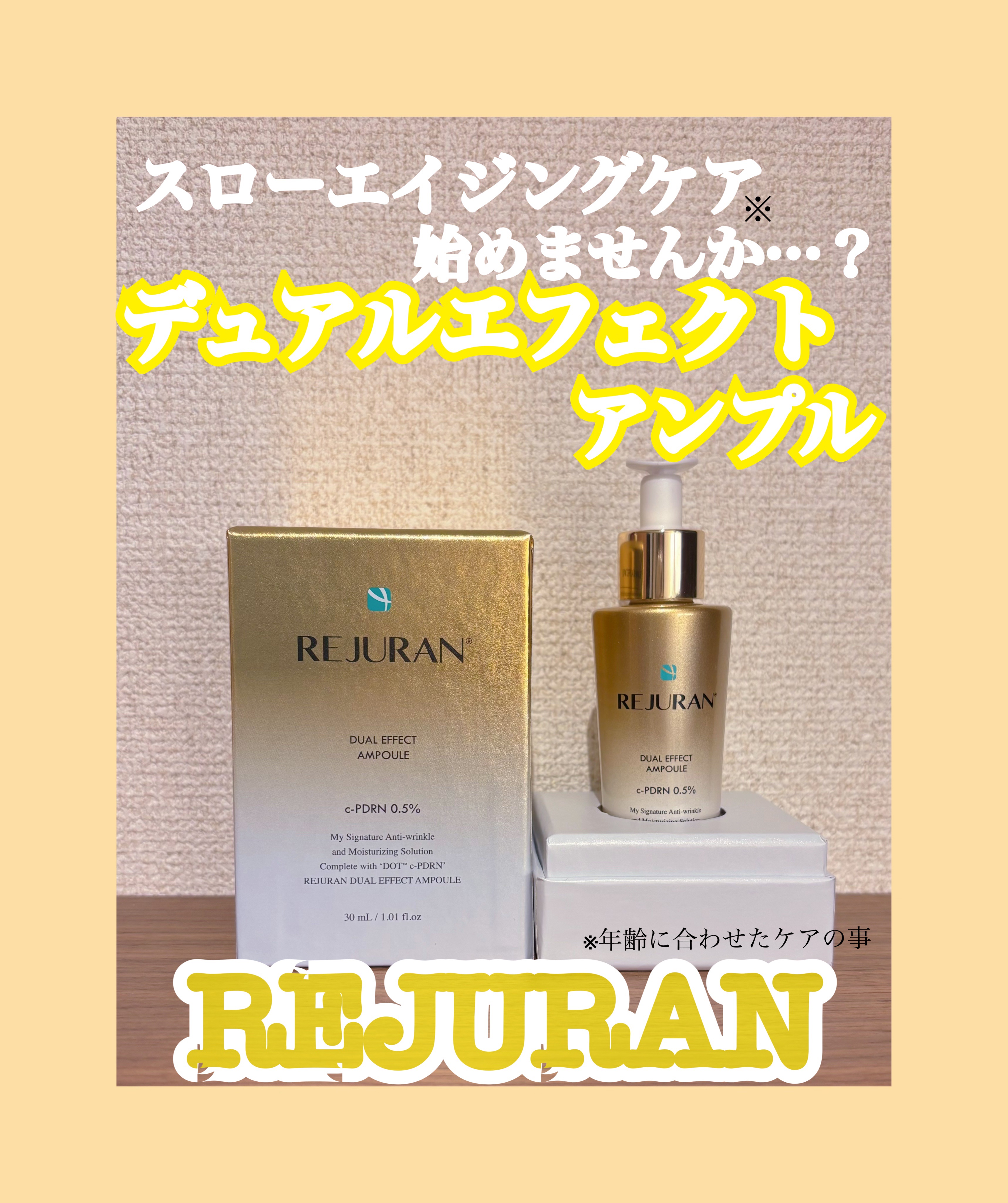 REJURANデュアルエフェクトアンプルDOTc-PDRNにセラミドまで配合された、アンチエイジングに特化したアンプル🫶🏻箱から高級感のある感じ😆✨少しとろみがあるけど、伸びがよくベタつかずお肌に馴染みやすい🎶刺激や香りもないから夜だけでなく...