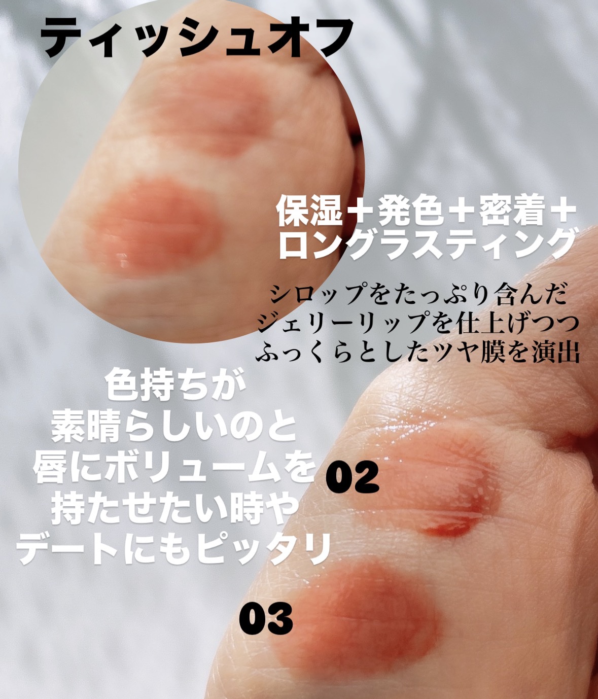 #商品提供《moonshotムーンショット》JellymoonGlowTint02ピーチソーダ03アルテミスコーラルジェリーのようなとろみのあるテクスチャーで、唇がぷるんとなります軽いつけ心地と高い保湿感カラーの持続性が高く、食事をしても色が...