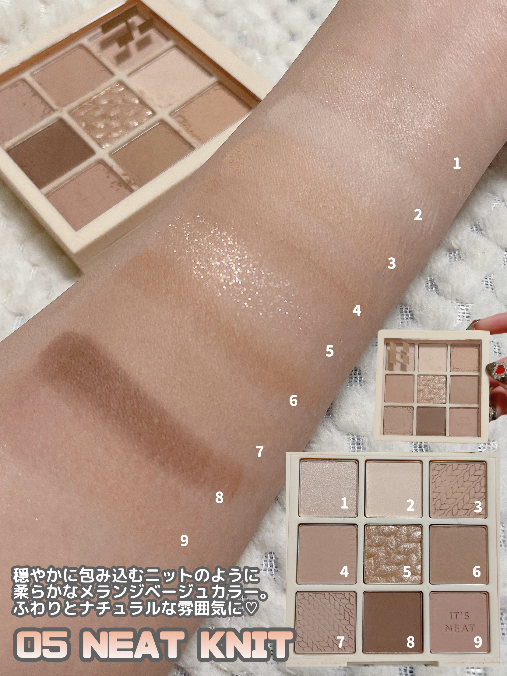- <05 ニートニット> 〈Oat-A〉タルク、合成フルオロフロゴパイト、窒化ホウ素、リンゴ酸ジイソステアリル、ミリスチン酸Mg、シ リカ、 ナイロン-12、 トリ(カプリル酸/カプリン酸)グリセリル、 メチルプロパンジオール、 マカデミア種子油、 ジ メチコン、ステアリン酸Mg、プロパンジオール、ラウロイルリシン、ヒドロキシプロピルビスパルミタミドMEA、ス テアリン酸ジメチコノール、トリエトキシカプリリルシラン、水酸化Al、メチコン、カオリン、水、香料、マイカ、酸化チ タン、酸化鉄、マンガンバイオレット、グンジョウ 〈Zero-B〉タルク、ナイロン-12、窒化ホウ素、ミリスチン酸Mg、 シリカ、 ジエチルヘキサン酸ネオペンチルグリコール、 フェニルトリメチコン、 メチルプロパンジオール、 ヘキサ(ヒ ドロキシステアリン酸/ステアリン酸/ロジン酸)ジペンタエリスリチル、 リンゴ酸ジイソステアリル、 ネオペンタン 酸イソステアリル、 ステアロイルオキシステアリン酸オクチルドデシル、 ステアリン酸Mg、 プロパンジオール、 ジメ チコン、ポリブテン、水添レシチン、 トリエトキシカプリリルシラン、水酸化Al、ラウロイルリシン、カオリン、水、香 料、マイカ、酸化チタン、酸化鉄、マンガンバイオレット、グンジョウ 〈Neat-C〉タルク、窒化ホウ素、シリカ、ステア ロイルオキシステアリン酸オクチルドデシル、フェニルトリメチコン、ジメチコン、ミリスチン酸Mg、ナイロン-12、 メチルプロパンジオール、 ヘキサ(ヒドロキシステアリン酸/ステアリン酸/ロジン酸)ジペンタエリスリチル、 マカ デミア種子油、 リンゴ酸ジイソステアリル、 水酸化Al、 プロパンジオール、 トリエトキシカプリリルシラン、 ステアリ ン酸Mg、ラウロイルリシン、サラソウジュ種子脂、水、カオリン、香料、マイカ、酸化チタン、酸化鉄、マンガンバイオ レット 〈Nougat-D〉タルク、合成フルオロフロゴパイト、シリカ、トリ(カプリル酸/カプリン酸)グリセリル、ミリス チン酸Mg、ステアリン酸Mg、マカデミア種子油、ジメチコン、メチルプロパンジオール、トリエトキシカプリリルシ ラン、ジミリスチン酸Al、プロパンジオール、カオリン、水酸化Al、マルトデキストリン、水、香料、マイカ、酸化鉄、 マンガンバイオレット、酸化チタン、グンジョウ、カルミン 〈Knot-E〉水、ホウケイ酸(Ca/Na)、合成フルオロフロ ゴパイト、ホウケイ酸(Ca/チタン)、ホウケイ酸(Ca/Al)、ジメチコン、ステアロイルオキシステアリン酸オクチル ドデシル、リンゴ酸ジイソステアリル、グリセリン、ミリスチン酸Mg、パルミチン酸イソプロピル、シリカ、オクテニ ルコハク酸デンプンAl、ステアリン酸Mg、ペンチレングリコール、ポリソルベート20、トリエトキシカプリリルシラ ン、 (アクリルアミド/アクリロイルジメチルタウリンNa)コポリマー、 酸化スズ、 ケイ酸(Al/Mg)、 オリーブ油脂 肪酸ソルビタン、ステアリン酸ソルビタン、イソヘキサデカン、フェノキシエタノール、ソルビン酸K、エチルヘキシル グリセリン、デヒドロ酢酸Na、ポリソルベート80、オレイン酸ソルビタン、トコフェロール、マイカ、酸化チタン、酸 化鉄 〈Cashew-F〉タルク、窒化ホウ素、ナイロン-12、ジエチルヘキサン酸ネオペンチルグリコール、シリカ、フェ ニルトリメチコン、ミリスチン酸Mg、メチルプロパンジオール、リンゴ酸ジイソステアリル、ヘキサ(ヒドロキシステ アリン酸/ステアリン酸/ロジン酸)ジペンタエリスリチル、 ネオペンタン酸イソステアリル、 ステアロイルオキシス テアリン酸オクチルドデシル、ステアリン酸Mg、プロパンジオール、ジメチコン、ポリブテン、水添レシチン、ラウロ イルリシン、水酸化Al、メチコン、トリエトキシカプリリルシラン、カオリン、水、香料、マイカ、酸化チタン、酸化鉄、マンガンバイオレット 〈Crochet-G〉タルク、窒化ホウ素、リンゴ酸 ジイソステアリル、ナイロン-12、シリカ、ミリスチン酸Mg、トリ(カプリル酸/カプリン酸)グリセリル、ステアリン酸Mg、メチルプロパンジオール、ステアリン酸ジメチコノール、 プロパンジオール、ジメチコン、ラウロイルリシン、ヒドロキシプロピルビスパルミタミドMEA、トリエトキシカプリリルシラン、カオリン、水酸化Al、メチコン、水、香料、マイカ、酸化 鉄、酸化チタン、マンガンバイオレット、グンジョウ 〈Button-H〉タルク、シリカ、リンゴ酸ジイソステアリル、窒化ホウ素、ナイロン-12、ミリスチン酸Mg、トリ(カプリル酸/カプリ ン酸)グリセリル、ステアリン酸Mg、メチルプロパンジオール、マカデミア種子油、ジメチコン、プロパンジオール、ステアリン酸ジメチコノール、ラウロイルリシン、ヒドロキシプロ ピルビスパルミタミドMEA、カオリン、トリエトキシカプリリルシラン、水酸化Al、メチコン、マルトデキストリン、水、香料、マイカ、酸化鉄、マンガンバイオレット、酸化チタン、グン ジョウ、カルミン、黄4 〈Knitted-I〉タルク、シリカ、ステアロイルオキシステ