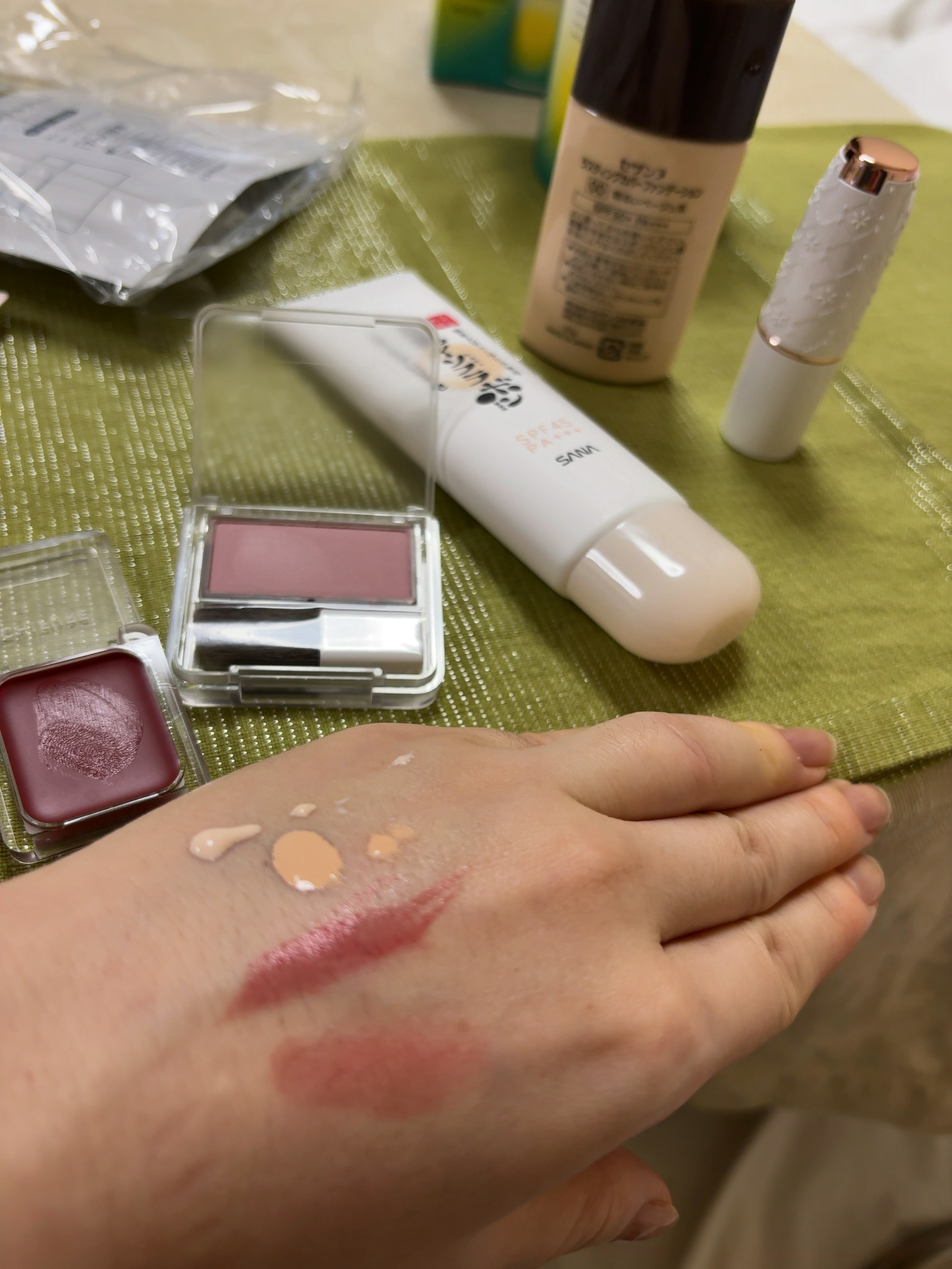 これで。ほわほわほっぺ(私の年齢でもよ!。:+((*´艸`))+:)よっ!これは、チークのグラデーションのベースにするのだ〜 MORNING BLUSH 06 クールな白ピンク。 MILKY PEACH 07 ピンクみの黄桃ヨーグルト SUNNY PINK 12 06にちょぴり赤とオレンジをまぜた NICE PINK 13 バランスのとれたイエベブルベ関係ない、ニュートラルなピンク。この中では1番赤み強い。私の写真より明るいかわいいピンクです。 どれも可愛い!どれもキュートなんですよ。 13番ナイスピンク以外は肌にのせるとニュアンス程度にしか変わらないかも。 毛穴目立たないし、容器も綺麗でほどいい。素敵な容器でも重いかさばるはいや。中身が良ければそれでいい、私はアラフィ!