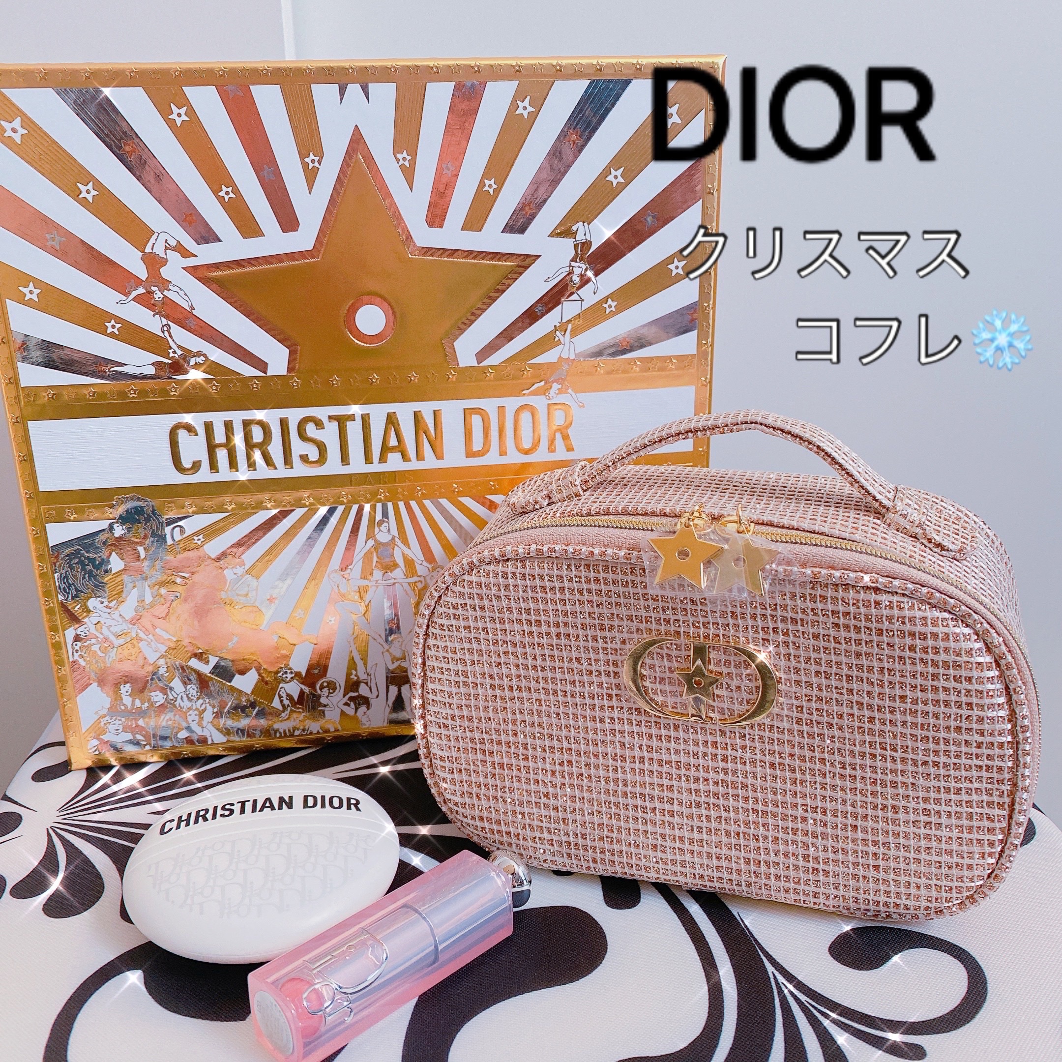 毎年楽しみにしているアディクトクリスマスオファー🎄💖 可愛いポーチにミスディオールとマキシマイザーのミニチュアが付くのですが、コレが本当に可愛いんです😍♥️ 今年のポーチはツイード風にキラキラ輝く素材がとっても可愛く、ラッキースターとCDロゴのチャームもめちゃくちゃ可愛い😍 内側は白色でCDロゴが散りばめられており、ポーチもいつもよりガバッと開くので使いやすさもあります❣️