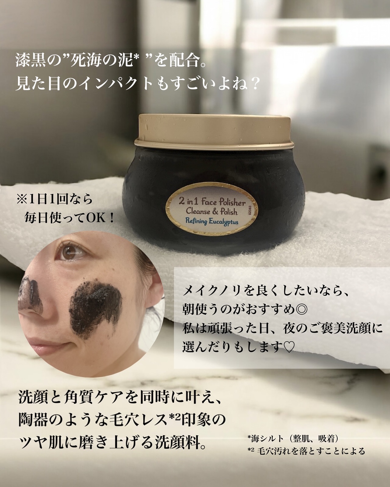 - 洗顔と角質ケアを同時に叶える、泡立て不要の2in1スクラブ洗顔。 汚れや古い角質を一掃し、透明感*2 のある、毛穴レス*3 のつや肌に磨き上げます。 死海の泥*4 配合で、過剰な皮脂のほか、肌表面や毛穴に堆積した汚染物質*5 を吸着し、くすみ*6 のない肌に導きます。 ミネラル豊富な死海の塩*7 配合で肌をすこやかに整え、ジェリコローズ*8 、ドナリエラ*9 配合で肌に潤いを与えます。 なめらかなクリームに浮かぶのは、植物由来のホホバエステル*10 とセルロース*11 によるスクラブ。丸く加工されていることで肌あたりがやさしく、肌の上をすべるようにして古い角質や毛穴の汚れをやさしく取り除きます。 オーガニックユーカリのエッセンシャルオイル*12 が、デトックスされるような清々しい香りをもたらします。 なめらかなテクスチャーで肌を包み込むように密着し、潤いを与えて肌荒れを防ぎます。 洗いあがりの肌は、洗顔後とは思えないほどしっとりとしたもちもちの感触に。 きめが整い、メイクのりのよいなめらかな肌を体感できます。 マイルドな使用感で、洗顔料として毎日(1日1回まで)使用できます。 泡立て不要で手軽に使用でき、毎日の時短ケアにおすすめです。 フロスト加工を施したラグジュアリーなガラスジャー、または持ち運びに便利なチューブの2種。 自然由来成分94%*13 。ヴィーガン処方*14 。 *1 ユーカリ葉油 *2 古い角質や肌の汚れを落とすことによる *3 毛穴汚れを落とすことによる *4 海シルト(整肌、吸着) *5 汚れ、ほこり、花粉など *6 古い角質や汚れのこと *7 海塩(整肌) *8 アンザンジュエキス(保湿) *9 デュナリエラサリナエキス(保湿) *10 ホホバエステル(洗浄補助) *11 セルロース(洗浄補助) *12 ユーカリ葉油 *13 自然由来指数94%(水を含む)ISO16128に基づく *14 動物性原料を含まない 発売日 2025年9月25日(木) ※9月18日(木)よりルミネ各店にて先行発売、SABON公式オンラインストアにて予約受付開始