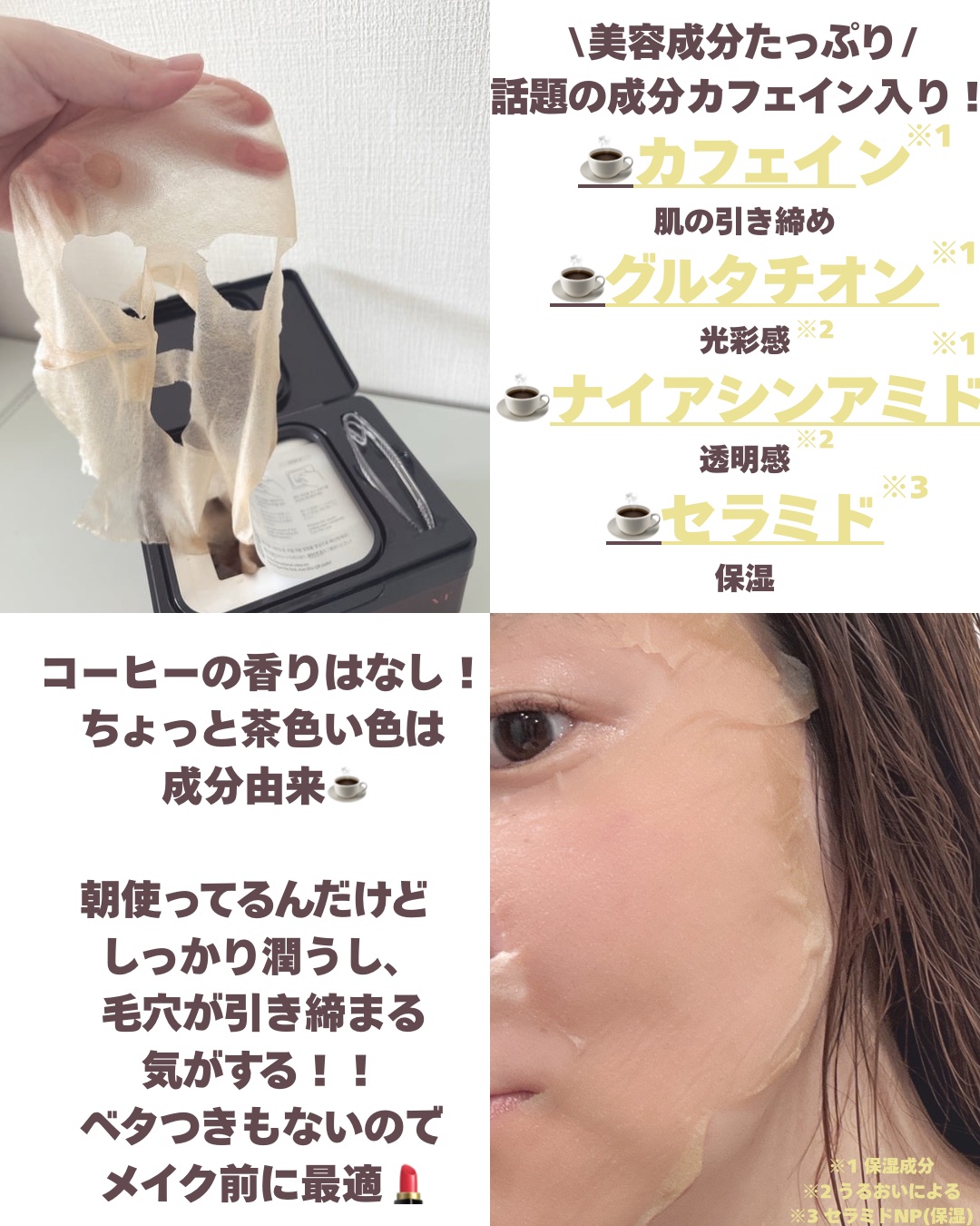 - カフェイン※1 配合で、肌を引き締め、すっきりとした印象へ導く。 グルタチオン※1 と ナイアシンアミド※1 が光彩感※2をプラスし、乾燥くすみが気になる肌にも明るい※2ツヤをプラス。 セラミド※3 を含む保湿成分が乾燥を防ぎ、しっとりとしたうるおいをキープ。 また、柔らかいシートが肌にやさしく密着し、朝晩問わず使いやすいテクスチャー。 ■こんな方におすすめ ・朝のメイク前に肌をすっきり整えたい方 ・夜のリラックスタイムに集中保湿ケアをしたい方 ・乾燥やくすみが気になる方 ※1:保湿成分 ※2:うるおいによる ※3:セラミドNP、セラミドAS、セラミドNS、セラミドAP、セラミドEOP(いずれも保湿) 2025年11月13日(木)より、全国PLAZA・MINiPLA※にて先行発売