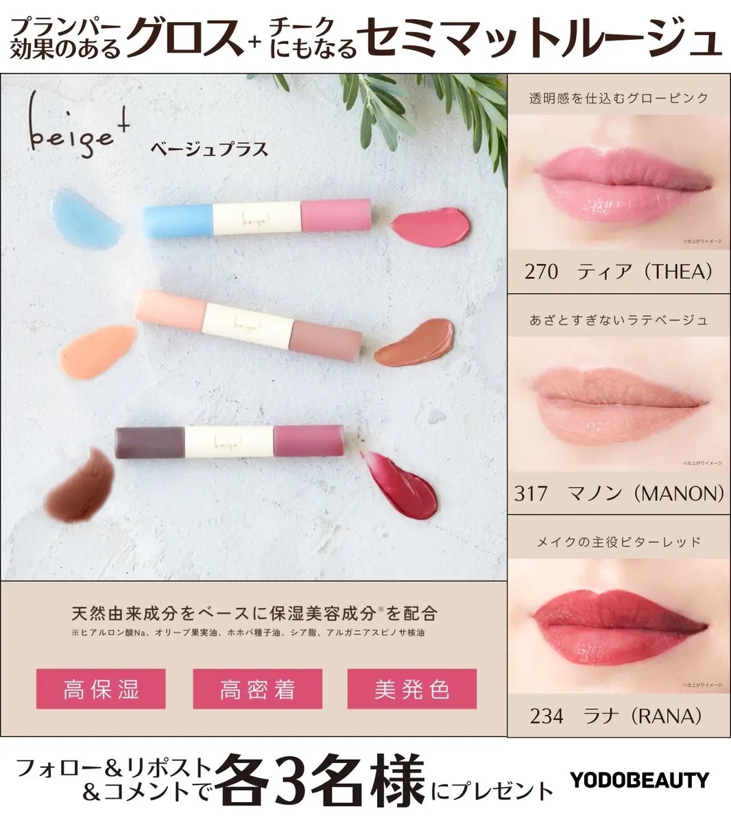 - ダブルエンドのベージュプラス ルジュロス。片方には唇をぷっくり見せて盛れるプランパー効果のあるグロスを、もう片方にはチークとしても使えるセミマットルージュを。それぞれの単色使いも、重ね塗りによるニュアンスも楽しめます。 天然由来成分をベースに保湿美容成分*を配合。 *ヒアルロン酸Na、オリーブ果実油、ホホバ種子油、シア脂、アルガニアスピノサ核油