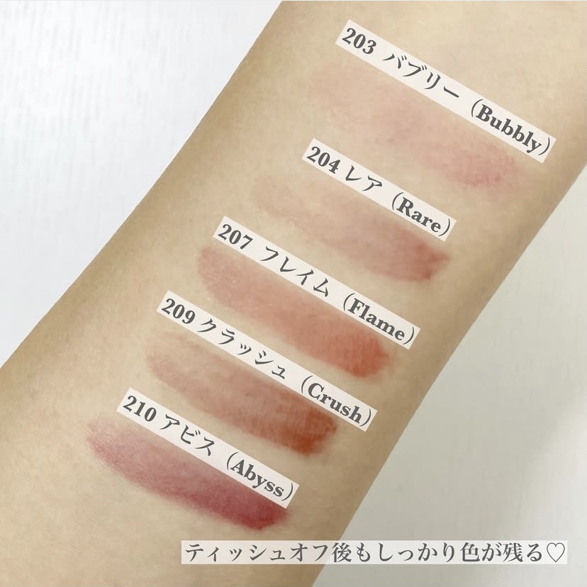 - <201 フェアリー> ダイマージリノール酸ジイソステアリル、ジフェニルシロキシフェニルトリメチコン、ビスジグリセリルポリアシルアジペート-2、水、ジフェニルジメチコン、水添ポリイソブテン、セチルPEG/PPG-10/1ジメチコン、ポリソルベート60、ペンチレングリコール、グリセリン、イソステアリン酸ポリグリセリル-4、フェノキシエタノール、1,2-ヘキサンジオール、セテアレス-20、酸化チタン (CI 77891)、(アクリル酸ヒドロキシエチル/アクリロイルジメチルタウリンNa)コポリマー、ステビオシド、スクワラン、香料、ジラウラミドグルタミドリシンNa、エチルヘキシルグリセリン、エチレンジアミンジコハク酸3Na、赤色227号 (CI 17200)、水酸化Al、黄色5号 (CI 15985)、ポリアクリル酸アンモニウム、イソステアリン酸ソルビタン、黄色4号 (CI 19140)、BG、赤色223号 (CI 45410)、青色1号 (CI 42090)、アラントイン、パンテノール、ツボクサエキス、ヒアルロン酸、加水分解ヒアルロン酸、ヒアルロン酸Na <203 バブリー> ダイマージリノール酸ジイソステアリル、ジフェニルシロキシフェニルトリメチコン、ビスジグリセリルポリアシルアジペート-2、水、ジフェニルジメチコン、水添ポリイソブテン、セチルPEG/PPG-10/1ジメチコン、ポリソルベート60、ペンチレングリコール、グリセリン、イソステアリン酸ポリグリセリル-4、フェノキシエタノール、1,2-ヘキサンジオール、セテアレス-20、(アクリル酸ヒドロキシエチル/アクリロイルジメチルタウリンNa)コポリマー、ステビオシド、酸化チタン (CI 77891)、スクワラン、香料、ジラウラミドグルタミドリシンNa、エチルヘキシルグリセリン、赤色227号 (CI 17200)、エチレンジアミンジコハク酸3Na、黄色5号 (CI 15985)、イソステアリン酸ソルビタン、水酸化Al、ポリアクリル酸アンモニウム、黄色4号 (CI 19140)、BG、青色1号 (CI 42090)、アラントイン、パンテノール、ツボクサエキス、ヒアルロン酸、加水分解ヒアルロン酸、ヒアルロン酸Na <204 レア> ダイマージリノール酸ジイソステアリル、ジフェニルシロキシフェニルトリメチコン、ビスジグリセリルポリアシルアジペート-2、水、ジフェニルジメチコン、水添ポリイソブテン、セチルPEG/PPG-10/1ジメチコン、ポリソルベート60、ペンチレングリコール、グリセリン、イソステアリン酸ポリグリセリル-4、フェノキシエタノール、1,2-ヘキサンジオール、セテアレス-20、(アクリル酸ヒドロキシエチル/アクリロイルジメチルタウリンNa)コポリマー、酸化チタン (CI 77891)、ステビオシド、スクワラン、香料、ジラウラミドグルタミドリシンNa、エチルヘキシルグリセリン、赤色227号 (CI 17200)、黄色5号 (CI 15985)、エチレンジアミンジコハク酸3Na、イソステアリン酸ソルビタン、水酸化Al、ポリアクリル酸アンモニウム、黄色4号 (CI 19140)、青色1号 (CI 42090)、BG、アラントイン、パンテノール、ツボクサエキス、ヒアルロン酸、加水分解ヒアルロン酸、ヒアルロン酸Na <205 ハニーデュー> ダイマージリノール酸ジイソステアリル、ジフェニルシロキシフェニルトリメチコン、ビスジグリセリルポリアシルアジペート-2、水、ジフェニルジメチコン、水添ポリイソブテン、セチルPEG/PPG-10/1ジメチコン、ポリソルベート60、ペンチレングリコール、グリセリン、イソステアリン酸ポリグリセリル-4、フェノキシエタノール、1,2-ヘキサンジオール、セテアレス-20、(アクリル酸ヒドロキシエチル/アクリロイルジメチルタウリンNa)コポリマー、酸化チタン (CI 77891)、ステビオシド、スクワラン、香料、ジラウラミドグルタミドリシンNa、エチルヘキシルグリセリン、赤色227号 (CI 17200)、黄色5号 (CI 15985)、エチレンジアミンジコハク酸3Na、イソステアリン酸ソルビタン、水酸化Al、ポリアクリル酸アンモニウム、黄色4号 (CI 19140)、青色1号 (CI 42090)、BG、アラントイン、パンテノール、ツボクサエキス、ヒアルロン酸、加水分解ヒアルロン酸、ヒアルロン酸Na <206 トフィー> ダイマージリノール酸ジイソステアリル、ジフェニルシロキシフェニルトリメチコン、ビスジグリセリルポリアシルアジペート-2、水、ジフェニルジメチコン、水添ポリイソブテン、セチルPEG/PPG-10/1ジメチコン、ポリソルベート60、ペンチレングリコール、グリセリン、イソステアリン酸ポリグリセリル-4、フェノキシエタノール、1,2-ヘキサンジオール、セテアレス-20、(アクリル酸ヒドロキシエチル/アクリロイルジメチルタウリンNa)コポリマー、ステビオシド、スクワラン、香料、ジラウラミドグルタミドリシンNa、酸化チタン (CI 77891)、エチルヘキシルグリセリン、黄色5号 (CI 15985)、エチレンジアミンジコハク酸3Na、黄色4号 (CI 19140)、赤色227号 (CI 17200)、イソステアリン酸ソルビタン、赤色223号 (CI 45410)、青色1号 (CI 42090)、水酸化Al、ポリアクリル酸アンモニウム、BG、アラントイン、パンテノール、ツボクサエキス、ヒアルロン酸、加水分解ヒアルロン酸、ヒアルロン酸Na <207 フレイム> ダイマージリノール酸ジイソステアリル、ジフェニルシロ