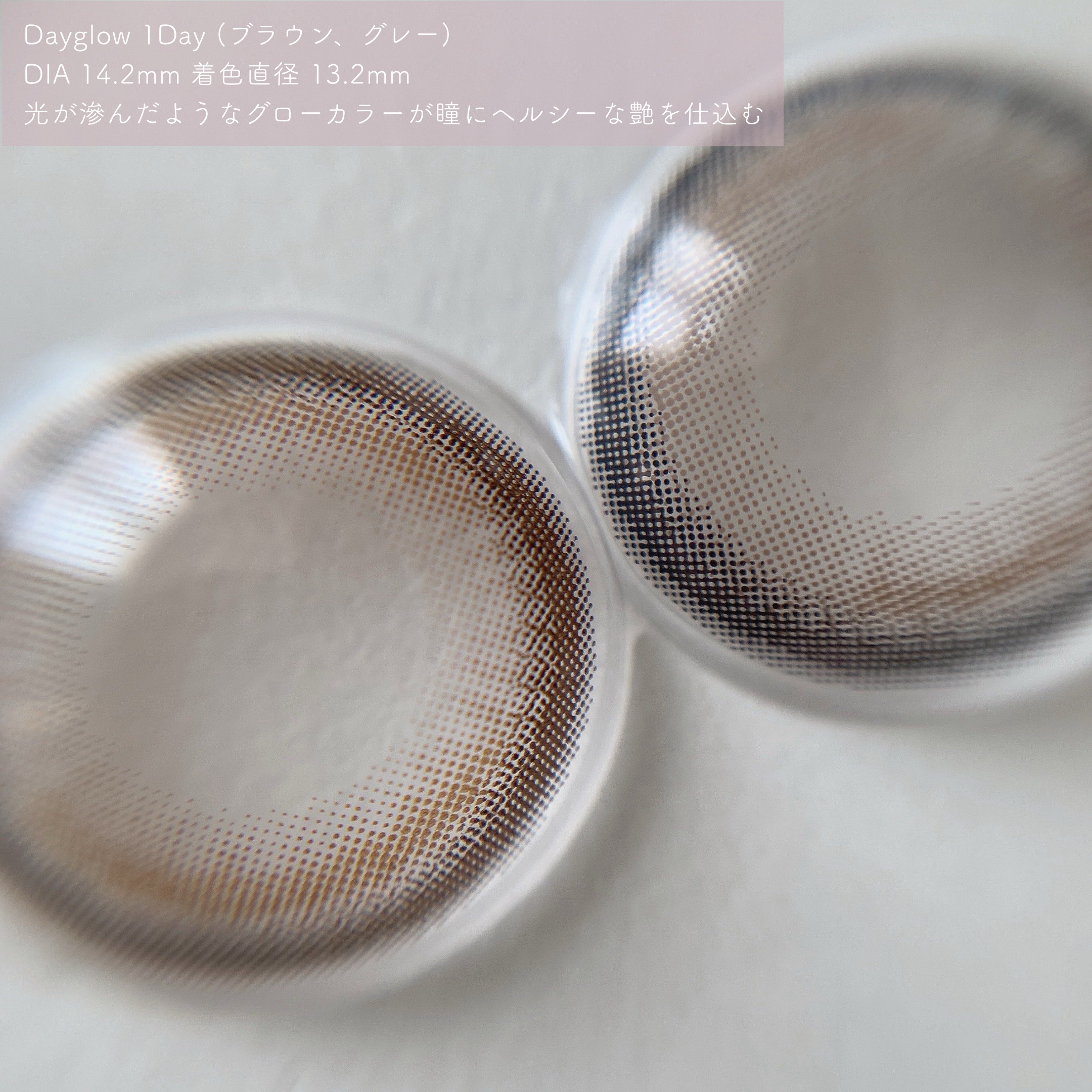 - ガラス玉に閉じ込めた無数のきらめきが、あなたの瞳で自信に変わる。 回っても、ずれても、輝きが続く”ガラス玉レンズ”。 <アイコニックグレー > 水面に揺れる光のようなきらめきで印象的な瞳を叶えます。 瞳の輪郭を優しく縁取る太フチに、象徴的な半月ハイライトが瞳に上品な立体感を与えます。 <アイコニックブラウン > 水面に揺れる光のようなきらめきで印象的な瞳を叶えます。 瞳の輪郭を優しく縁取る太フチに、象徴的な半月ハイライトが瞳に上品な立体感を与えます。 <スターフレアグレー > 降り注ぐ星屑のようなハイライトデザインが、ドラマティックな輝きを与えます。 視線を奪うくっきりとした細フチに、繊細に重なり合うハイライトが主役級の輝きをプラスします。 <スターフレアベージュ > 降り注ぐ星屑のようなハイライトデザインが、ドラマティックな輝きを与えます。 視線を奪うくっきりとした細フチに、繊細に重なり合うハイライトが主役級の輝きをプラスします。 <デイグローグレー> 光をふわりと滲ませるグローカラーが、瞳にヘルシーな艶を仕込みます。 ナチュラルに滲むようなぼかしフチでくりっとした立体感を演出し、内側のグロウカラーが、瞳に光沢感をプラスします。 <デイグローブラウン > 光をふわりと滲ませるグローカラーが、瞳にヘルシーな艶を仕込みます。 ナチュラルに滲むようなぼかしフチでくりっとした立体感を演出し、内側のグロウカラーが、瞳に光沢感をプラスします。 カラーコンタクトレンズの不適正使用による眼障害の危険性等などがあります。 ●コンタクトレンズは高度管理医療機器です。不十分な洗浄・消毒など不適切なケアや、長時間・交換期間を超えた装用により、アレルギー性結膜炎、角膜感染症、角膜潰瘍等の重篤な眼障害が発生する危険性があります ●ご使用前に取扱説明書を確認してください 使用上の留意事項 ●眼科医院等を受診してからお求めください ●眼に異常を感じたら直ちにレンズ使用を中止し、お近くの眼科等で診察を受けてください ●医師の指示にしたがってご使用ください ●コンタクトレンズを装用する場合、自覚症状がなくても、眼科医院等での定期検査を受けてください ●レンズに不具合がある場合は使用しないでください