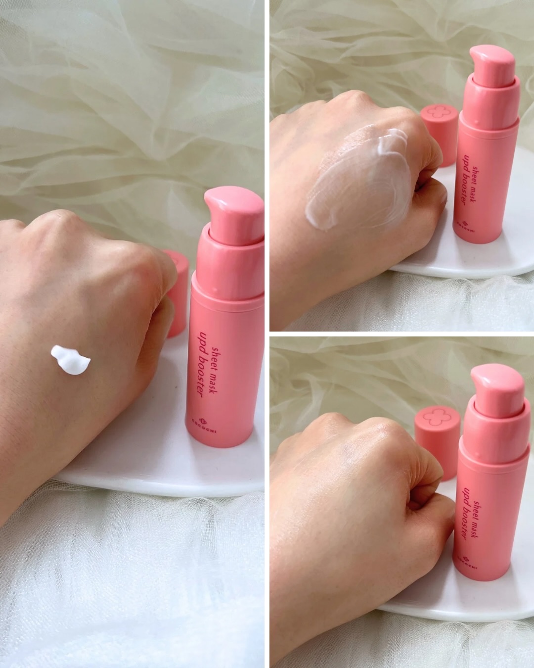 - 新定番 シートマスクをアプデする導入クリーム シートマスクの前にはアプデブースター ご使用のマスクに含まれる成分を肌になじませ、すみずみまで浸透(角質層まで) マスクの後にはうるおい効果でぷるんと弾むような水艶肌へ マスク前 ●スクワラン&ヒト型セラミド*¹で保湿と柔軟効果をキープ マスク中 ●CICA*²が肌コンディションをサポートし、肌を整える ●コショウ由来エキス*³で肌のすみずみまで浸透(角質層まで) ●3種のハリツヤ成分*⁴(RejuveNAD™*⁵、フラーレン、クララ根エキス)がハリツヤを引き出す ●独自原料ORIMOS®*⁶(オリモス)自然由来エキスのコンプレックスが肌の柔軟性をサポート マスク後 ●ぷるんと水艶肌 シートマスクご使用の直前にお使いいただくクリームです。 ① 適量(4-5プッシュ程度)を手に取ります。 ② ハンドプレスしながら顔全体にやさしくなじませます。 ④ お持ちのシートマスクを使用してください。 ⑤ ご使用後に手のひらでお顔にふれていつもとの肌触りの違いを感じてみてください。 *1 セラミドAP(保湿成分) *2 ツボクサ葉/茎エキス(保湿成分) *3 テトラヒドロピペリン(整肌成分) *4 ヒマワリ芽エキス、フラーレン、クララ根エキス(すべで保湿成分) *5 ヒマワリ芽エキス(保湿成分) *6 ビワ葉エキス、ローズマリー葉エキス、ウメ果実エキス、チャ葉エキス、マタタビ果実エキス(すべで保湿成分)