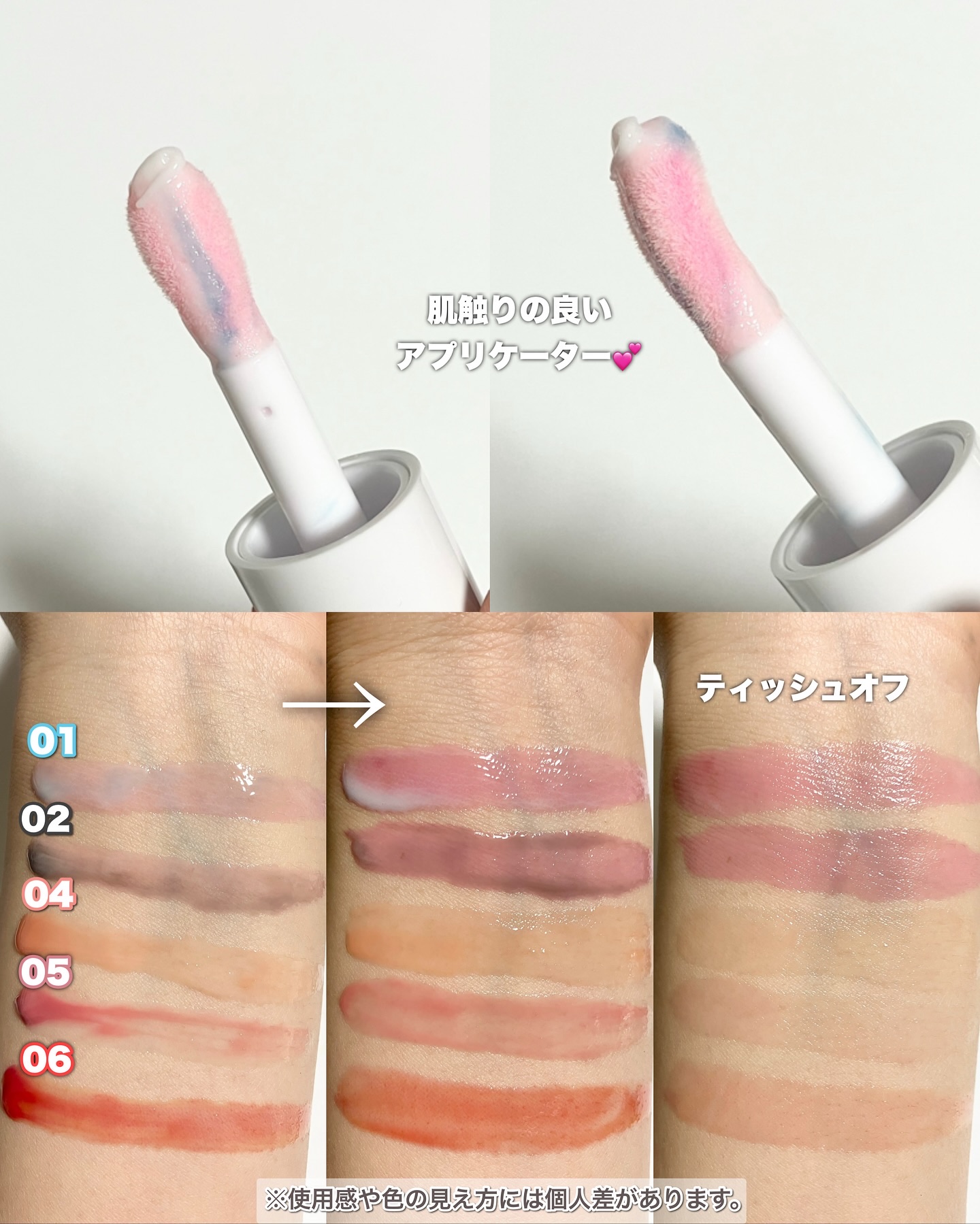 相変わらずオシャレなパケ❤️ このカラーがとてもキュート🥰 むっちり、と肌に密着しながらも伸びが良いです。 ぷるんとした質感❤️ 唇に塗ると、ほんのりスースー感。 香りはほぼないかな? カサついた私の薄い唇もふっくらナチュラルにプルンと ❤️ 透けるので、オーバーリップにする場合は重ね塗りでたっぷりした方が良さそう。 しっとりして👌 グロスのむちむち感はありますが、私には不快なベタベタ感ではなかったです。 また、ティッシュオフすると色は落ちちゃいますが、しっとり感は残ります❤️ 縦じわが目立ちにくくて良いです❤️ 他のリップと重ねるのも楽しみ🥰 1本持っておくと重宝しそうです☺️💕