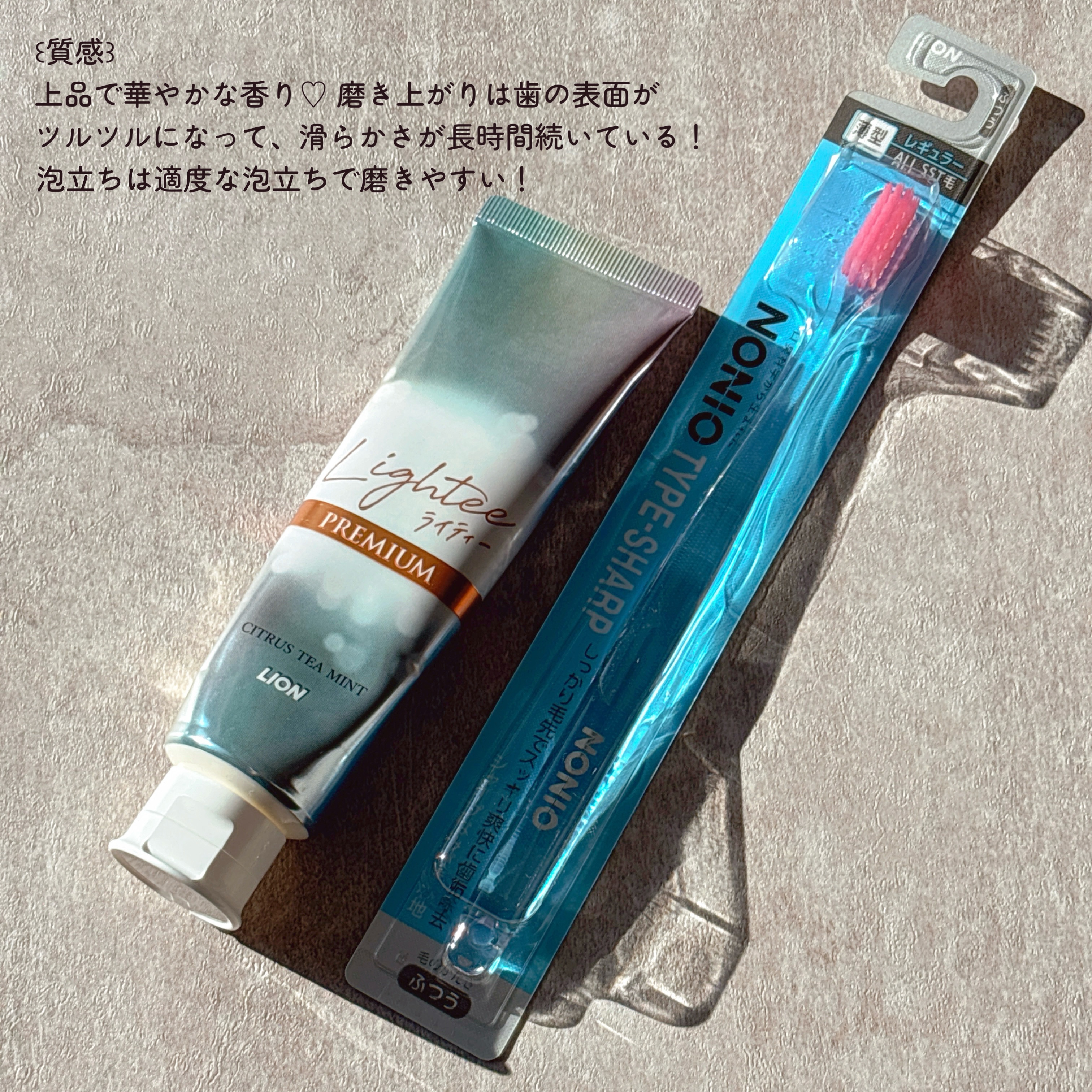 ライオンさまからいただきました✨LighteeハミガキPREMIUM【医薬部外品】パッケージはシンプルで高級感あり😊キャップは片手で開閉できて便利✨歯磨き粉は泡立ち控えめで口の中がもこもこになりすぎず歯を磨きやすいです。上質な紅茶とビターな柑...