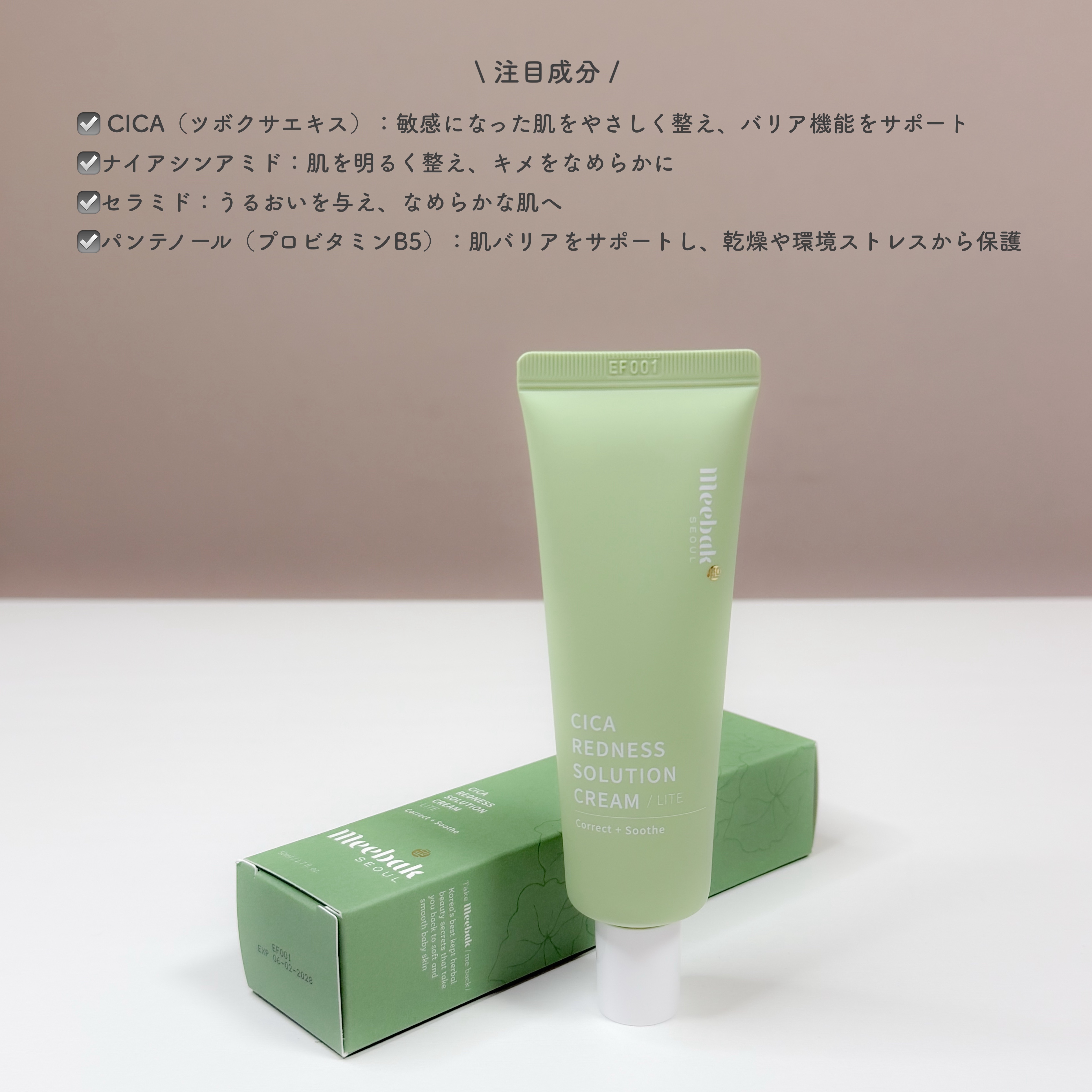 #PRMeebakCICAレッドネスクリームライトスキンケア発想のうるおい下地♡CICA、ナイアシンアミド、セラミド、パンテノールなどを配合。グリーンからベージュに自然に変化。化粧下地・CCクリーム・スポットコンシーラーとしてマルチに活躍し、...