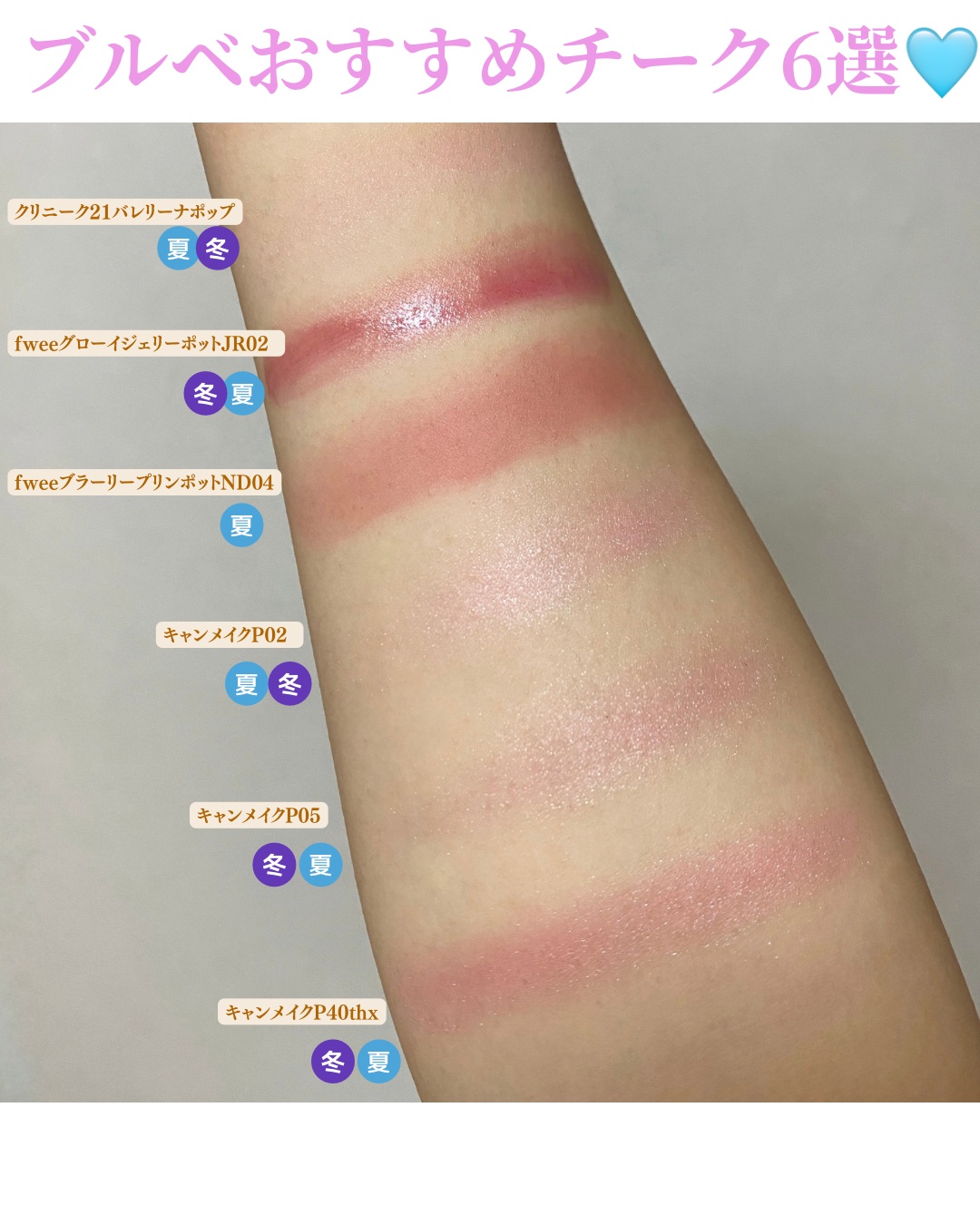 先生のおすすめ投稿とても勉強になります🫶 キャンメイクのP05は肌に塗るとくすみの無い明るいオレンジに発色してびっくりしました😳40thxは赤ピンクに発色して使いやすそうでした💖