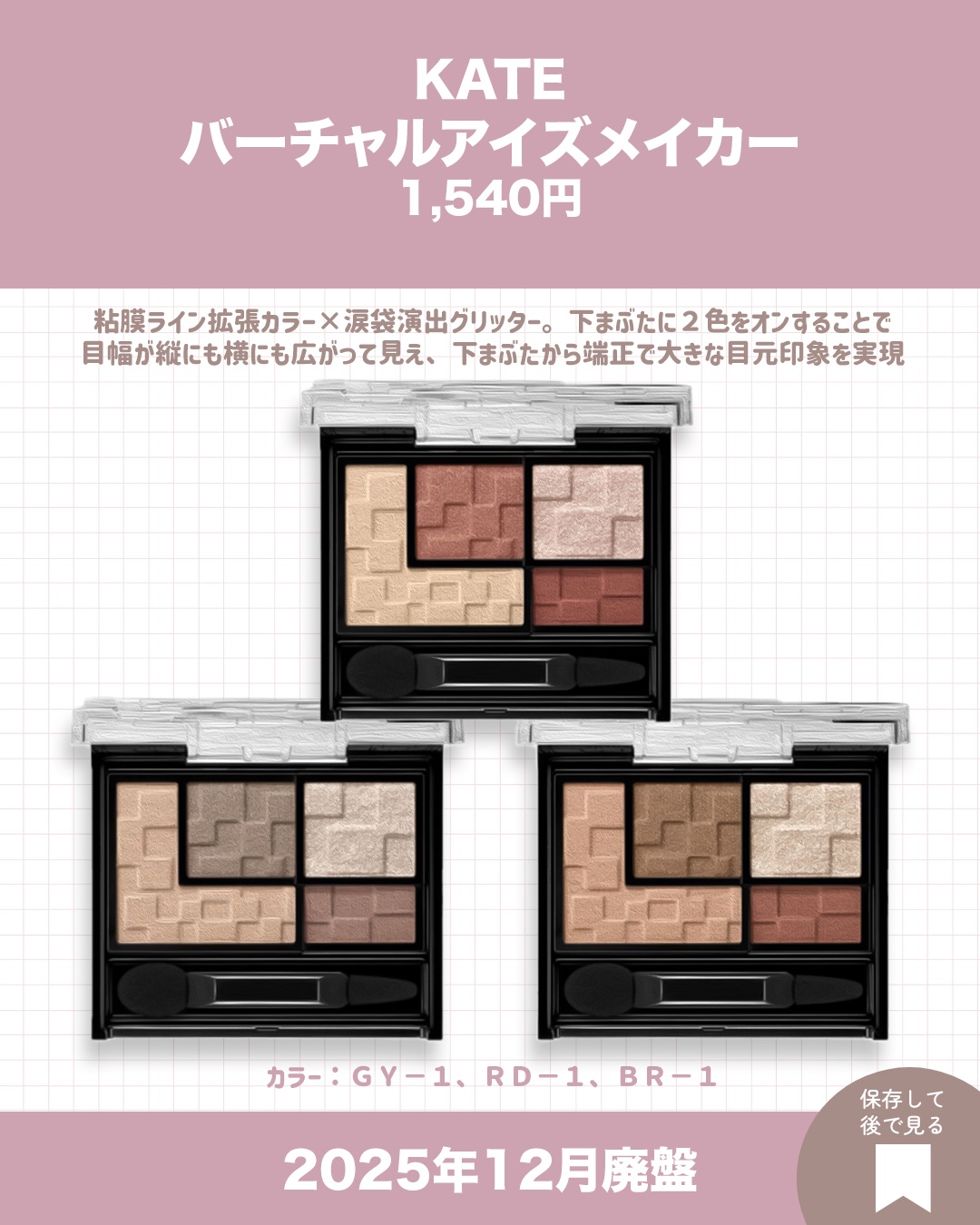 保存推奨!?KATEの人気商品が廃盤…🥲KATE☑︎リアルカバーリキッド(セミマット)01/02/03/04各¥1,760(税込)☑︎バーチャルアイズメイカーNL-1フタシカOR-1タソガレGN-1クサイロGY-1マドロミRD-1ヨカンBR-...