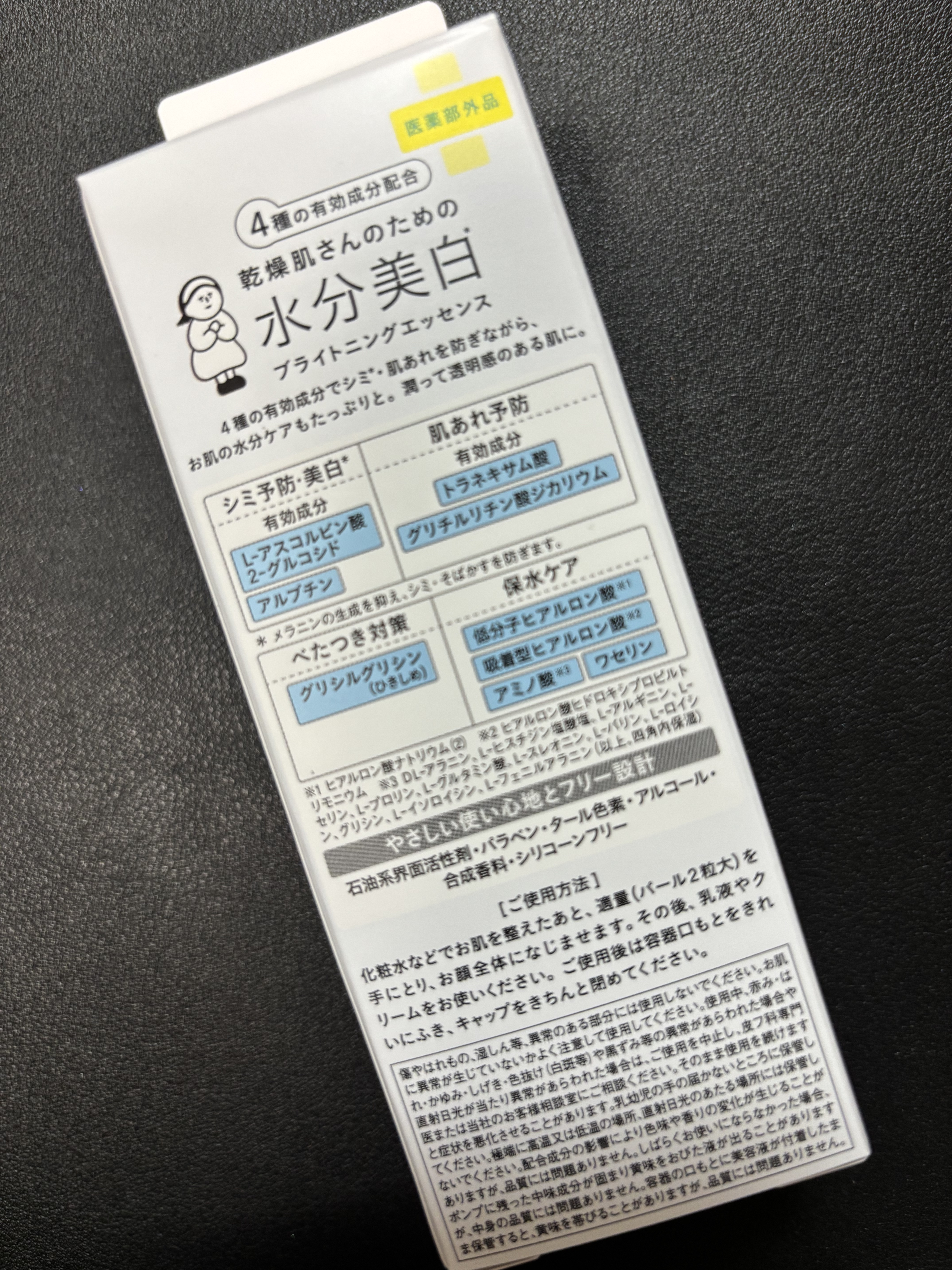 - ※2025年1月14日よりBCL ECサイト・一部企業にて先行発売 【医薬部外品】 乾燥による肌あれを防いで、潤いの透明肌へ! 4種の有効成分配合。薬用水分美白*1エッセンス 【配合成分】 シミ*1や肌あれを防ぎながら、透明感のある肌へ 4種の有効成分配合でシミ*1・肌あれを防ぎながら、肌の潤いを保ちます。 ●シミ*1予防・美白*1 有効成分:L-アスコルビン酸2-グルコシド、アルブチン ●肌あれ予防 有効成分:トラネキサム酸、グリチルリチン酸ジカリウム ●肌のべたつきを抑えながら、潤いもしっかりキープ 肌にたっぷり潤いを与えながら、乾燥によるベタつきを抑えます。 べたつき対策:グリシルグリシン(ひきしめ) 保水ケア:低分子ヒアルロン酸、吸着型ヒアルロン酸、アミノ酸、ワセリン ●やさしい使い心地とフリー設計 石油系界面活性剤、パラベン、ター、色素、アルコール、合成香料、シリコーン *1 メラニンの生成を抑え、シミ・そばかすを防ぎます。 *2 ヒアルロン酸ナトリウム(2) *3 ヒアルロン酸ヒドロキシプロピルトリモニウム *4 DL-アラニン、L-ヒスチジン塩酸塩、L-アルギニン、L-セリン、L-プロリン、L-グルタミン酸、L-スレオニン、 L- バリン、L-ロイシン、グリシン、L-イソロイシン、L-フェニルアラニン(以上、全て保湿)