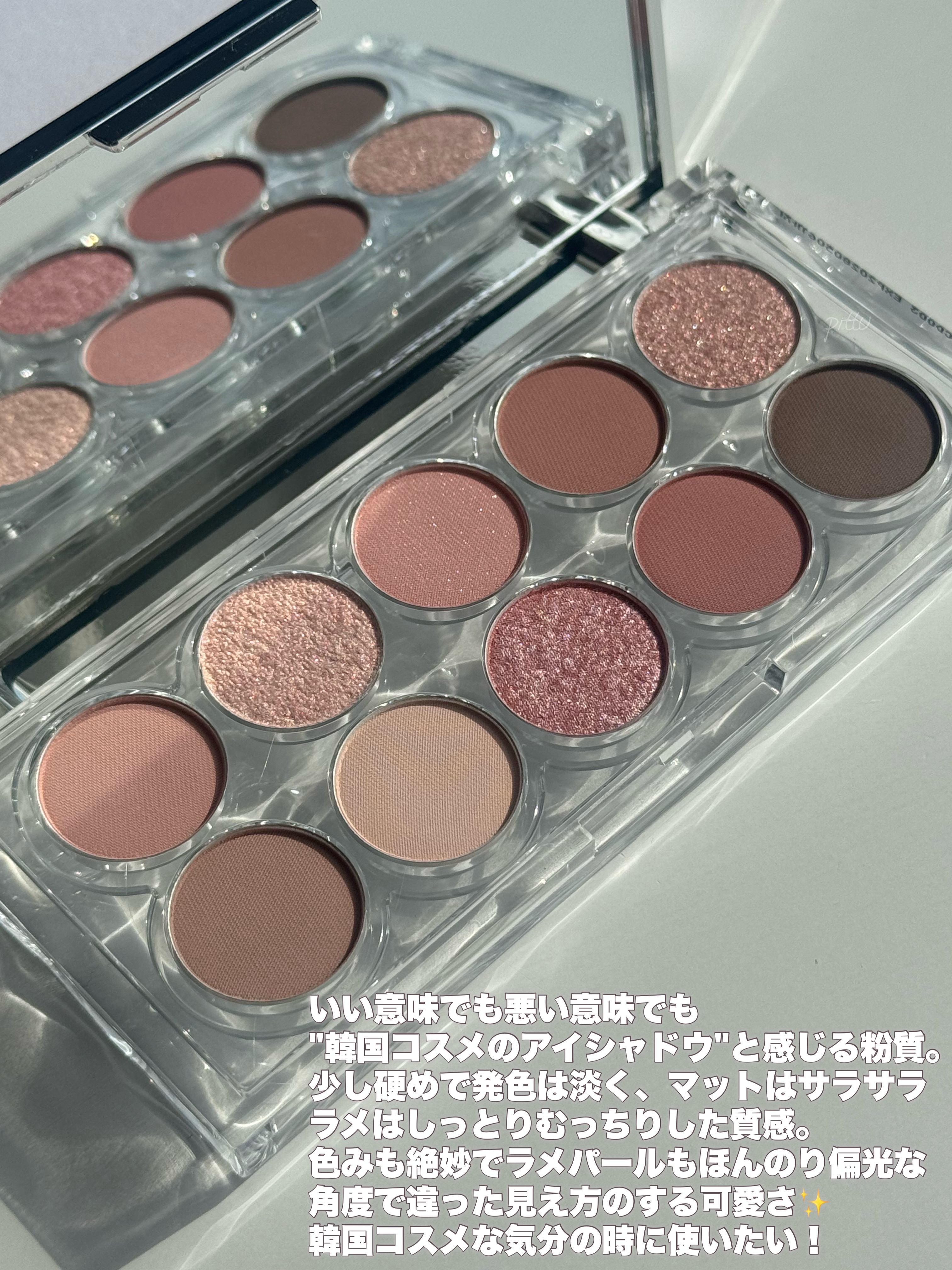 カラバリは2色展開、公式情報がないので不安ですがどうやら限定販売のようです! 01 プリュムフラワー ピンクベージュ系でまとめられたパレット 全体的にライトなピンクが多く、イエベ春の方向きに感じます 02 ボヌールマロン 赤みのあるカラーでまとめられたパレット 明るいカラーもありますがベージュや赤みブラウン等イエベ秋の方向きに感じます 表面のエンボス加工もかわいいのばっかりですね! ラメ強めが格子柄だからわかりやすいし、まとまりが良い⸜(๑⃙⃘'ᵕ'๑⃙⃘)⸝⋆* ちなみにこちらのパレットは8色も入っているのにかなりコンパクトで、1色の大きさが私の親指の爪よりちょい大きめという嬉しさ…! フタの水面のデザインは内側だけに施されているので、表面はツルッとしていますよ🌊 チップもふわふわで、多色パレット専用のサイズ感で長めなのが嬉しい♪ とにかく話題になっているこちら、可愛すぎるから在庫無くなるのお願い待って…🙏🏻💦