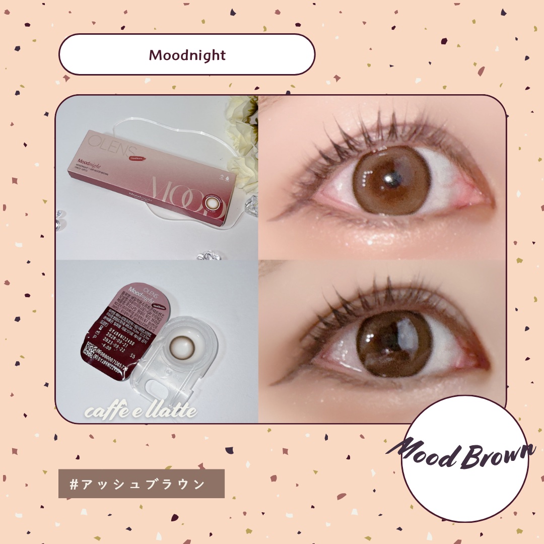 OLENS\Moodnightシリーズ/☑️Moodnight1MonthMoodChocoDIA14.0mm着色直径13.3mm含水率38%真ん中までふんわり溶け込むグラデーションフチとアッシュ感のあるカラーで雰囲気のある目元を演出。☑️M...