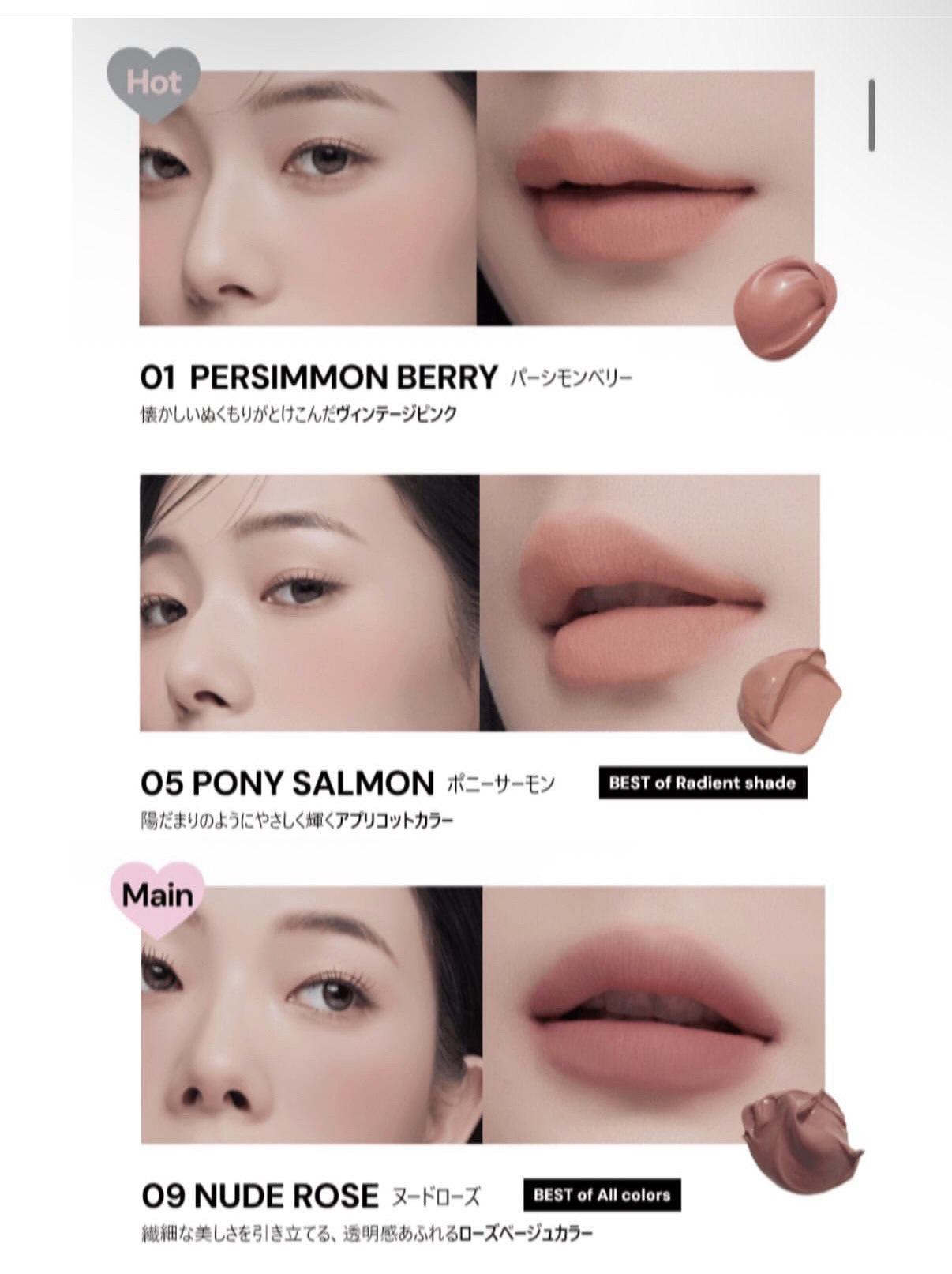 - <01 パーシモンベリー> イソドデカン、オクチルドデカノール、酸化チタン、(ビニルジメチコン/メチコンシルセスキオキサン)クロスポリマー、シリカ、タルク、水添(スチレン/イソプレン)コポリマー、トリ(カプリル酸/カプリン酸)グリセリル、ジメチコン、ポリメチルシルセスキオキサン、ジステアルジモニウムヘクトライト、セスキオレイン酸ソルビタン、(ジメチコン/ビニルジメチコン)クロスポリマー、1,2-ヘキサンジオール、炭酸プロピレン、赤酸化鉄、黄酸化鉄、黄4、香料、赤202、エチルヘキシルグリセリン、黒酸化鉄、赤104(1)、テトラ(ジ-t-ブチルヒドロキシヒドロケイヒ酸)ペンタエリスリチル <02 フロストピン> イソドデカン、オクチルドデカノール、酸化チタン、タルク、(ビニルジメチコン/メチコンシルセスキオキサン)クロスポリマー、シリカ、水添(スチレン/イソプレン)コポリマー、トリ(カプリル酸/カプリン酸)グリセリル、ジメチコン、ポリメチルシルセスキオキサン、ジステアルジモニウムヘクトライト、セスキオレイン酸ソルビタン、(ジメチコン/ビニルジメチコン)クロスポリマー、1,2-ヘキサンジオール、炭酸プロピレン、赤酸化鉄、赤202、香料、黄酸化鉄、エチルヘキシルグリセリン、テトラ(ジ-t-ブチルヒドロキシヒドロケイヒ酸)ペンタエリスリチル <03 ライラックヘイズ> イソドデカン、オクチルドデカノール、酸化チタン、タルク、(ビニルジメチコン/メチコンシルセスキオキサン)クロスポリマー、シリカ、水添(スチレン/イソプレン)コポリマー、トリ(カプリル酸/カプリン酸)グリセリル、ジメチコン、ポリメチルシルセスキオキサン、ジステアルジモニウムヘクトライト、セスキオレイン酸ソルビタン、(ジメチコン/ビニルジメチコン)クロスポリマー、1,2-ヘキサンジオール、炭酸プロピレン、香料、黒酸化鉄、赤202、エチルヘキシルグリセリン、黄酸化鉄、赤酸化鉄、テトラ(ジ-t-ブチルヒドロキシヒドロケイヒ酸)ペンタエリスリチル <04 ヌードダスク> イソドデカン、オクチルドデカノール、酸化チタン、タルク、(ビニルジメチコン/メチコンシルセスキオキサン)クロスポリマー、シリカ、水添(スチレン/イソプレン)コポリマー、トリ(カプリル酸/カプリン酸)グリセリル、ジメチコン、ポリメチルシルセスキオキサン、ジステアルジモニウムヘクトライト、セスキオレイン酸ソルビタン、(ジメチコン/ビニルジメチコン)クロスポリマー、黄酸化鉄、1,2-ヘキサンジオール、炭酸プロピレン、赤酸化鉄、香料、黒酸化鉄、エチルヘキシルグリセリン、テトラ(ジ-t-ブチルヒドロキシヒドロケイヒ酸)ペンタエリスリチル <05 ポニーサーモン> イソドデカン、オクチルドデカノール、酸化チタン、タルク、(ビニルジメチコン/メチコンシルセスキオキサン)クロスポリマー、シリカ、水添(スチレン/イソプレン)コポリマー、トリ(カプリル酸/カプリン酸)グリセリル、ジメチコン、ポリメチルシルセスキオキサン、ジステアルジモニウムヘクトライト、セスキオレイン酸ソルビタン、(ジメチコン/ビニルジメチコン)クロスポリマー、1,2-ヘキサンジオール、炭酸プロピレン、赤酸化鉄、香料、エチルヘキシルグリセリン、黄酸化鉄、黒酸化鉄、テトラ(ジ-t-ブチルヒドロキシヒドロケイヒ酸)ペンタエリスリチル <06 フリップピーチ> イソドデカン、オクチルドデカノール、タルク、酸化チタン、(ビニルジメチコン/メチコンシルセスキオキサン)クロスポリマー、シリカ、水添(スチレン/イソプレン)コポリマー、トリ(カプリル酸/カプリン酸)グリセリル、ジメチコン、ポリメチルシルセスキオキサン、ジステアルジモニウムヘクトライト、セスキオレイン酸ソルビタン、(ジメチコン/ビニルジメチコン)クロスポリマー、黄5、1,2-ヘキサンジオール、炭酸プロピレン、黄酸化鉄、赤酸化鉄、香料、赤202、エチルヘキシルグリセリン、黒酸化鉄、テトラ(ジ-t-ブチルヒドロキシヒドロケイヒ酸)ペンタエリスリチル <07 アプリサン> イソドデカン、オクチルドデカノール、タルク、(ビニルジメチコン/メチコンシルセスキオキサン)クロスポリマー、シリカ、水添(スチレン/イソプレン)コポリマー、トリ(カプリル酸/カプリン酸)グリセリル、ジメチコン、ポリメチルシルセスキオキサン、酸化チタン、ジステアルジモニウムヘクトライト、黄4、赤酸化鉄、セスキオレイン酸ソルビタン、(ジメチコン/ビニルジメチコン)クロスポリマー、1,2-ヘキサンジオール、赤104(1)、炭酸プロピレン、香料、赤202、エチルヘキシルグリセリン、テトラ(ジ-t-ブチルヒドロキシヒドロケイヒ酸)ペンタエリスリチル <08 ローコーラル> イソドデカン、オクチルドデカノール、タルク、(ビニルジメチコン/メチコンシルセスキオキサン)クロスポリマー、シリカ、水添(スチレン/イソプレン)コポリマー、トリ(カプリル酸/カプリン酸)グリセリル、酸化チタン、ジメチコン、ポリメチルシルセスキオキサン、ジステアルジモニウムヘクトライト、セスキオレイン酸ソルビタ