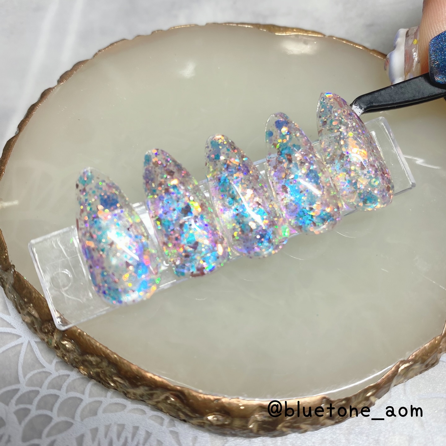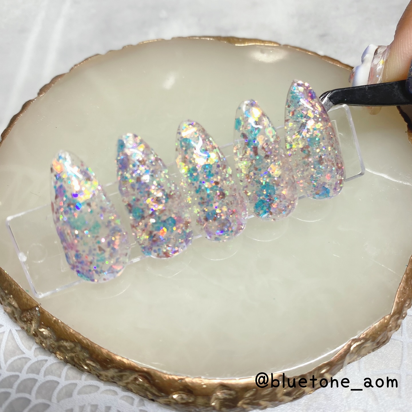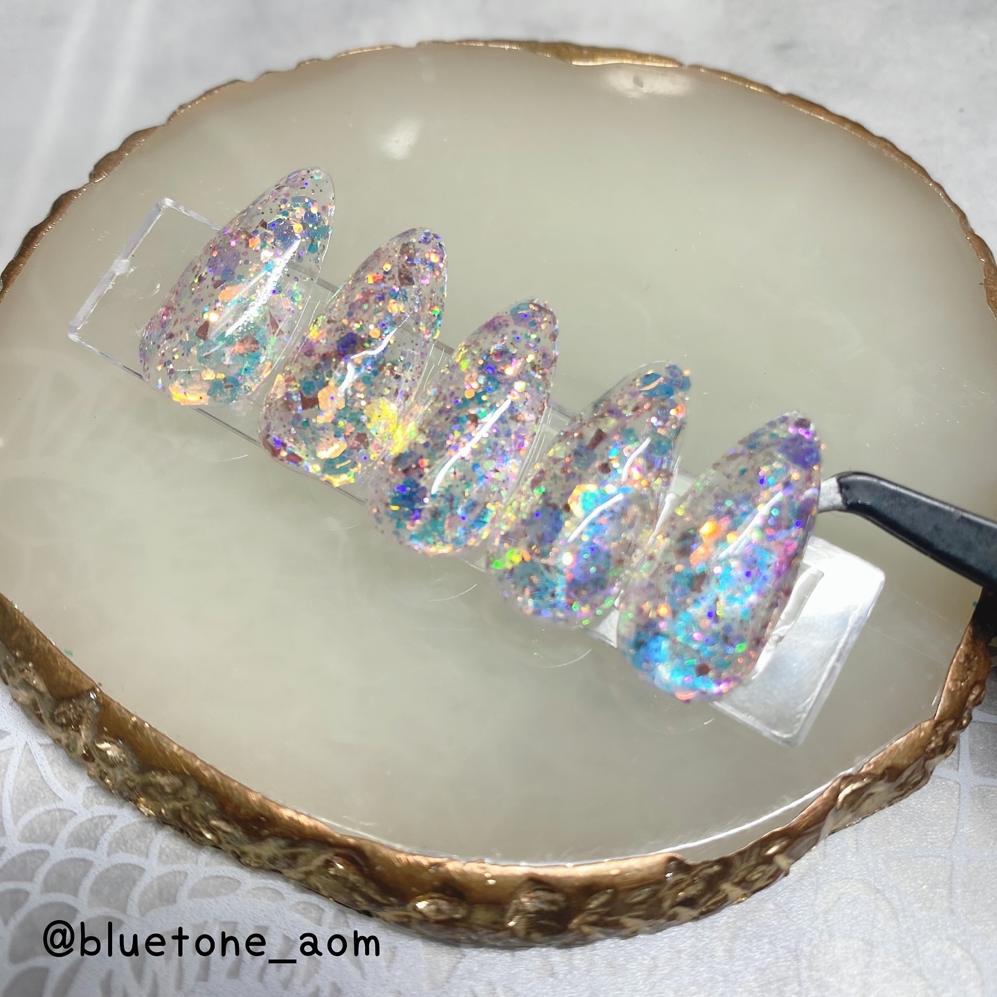 ラメがしっかりしてるし クリアカラーが入ってるから オーロラパウダー無しでも 充分キラキラしました! 反射強めのフィルムなので 実物はもっと うるうるとキラキラが強いです! ビー玉みたい🥺 ネイルシール長持ちさせたいけど ちょっと飽きてきたな〜って時とかに 全然違った印象になるのでオススメです! Seriaのベースジェル 本当にうるうるネイルしやすいので オススメしたい🙆♀️