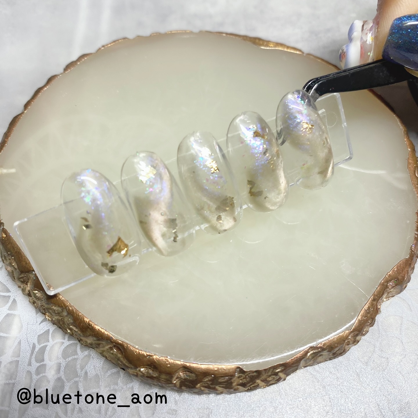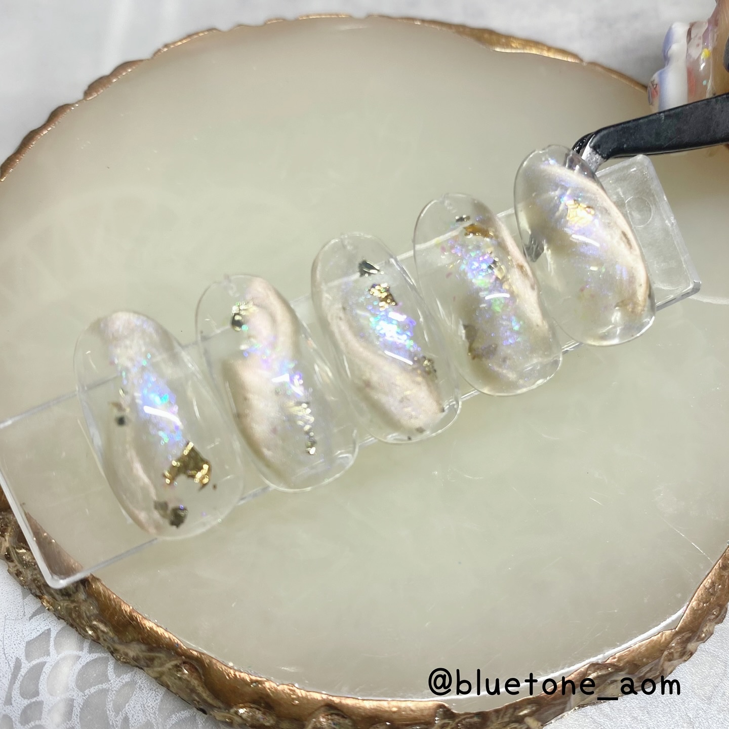 ラメがしっかりしてるし クリアカラーが入ってるから オーロラパウダー無しでも 充分キラキラしました! 反射強めのフィルムなので 実物はもっと うるうるとキラキラが強いです! ビー玉みたい🥺 ネイルシール長持ちさせたいけど ちょっと飽きてきたな〜って時とかに 全然違った印象になるのでオススメです! Seriaのベースジェル 本当にうるうるネイルしやすいので オススメしたい🙆♀️