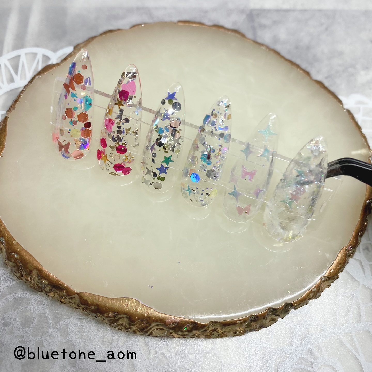 ラメがしっかりしてるし クリアカラーが入ってるから オーロラパウダー無しでも 充分キラキラしました! 反射強めのフィルムなので 実物はもっと うるうるとキラキラが強いです! ビー玉みたい🥺 ネイルシール長持ちさせたいけど ちょっと飽きてきたな〜って時とかに 全然違った印象になるのでオススメです! Seriaのベースジェル 本当にうるうるネイルしやすいので オススメしたい🙆♀️