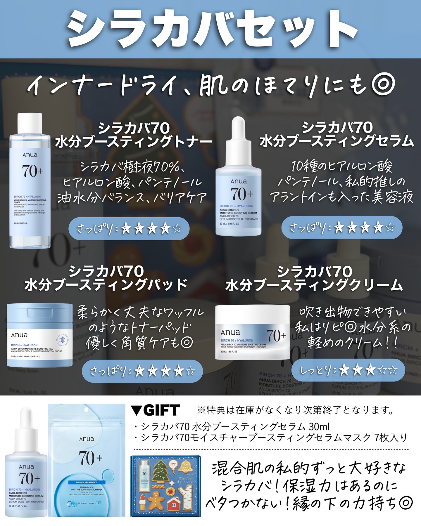 新作の角質ケア化粧水は、週に1回程度 拭き取りとして夜に使うのが私には あっていました😌 公式では、夜のみ🌙2日に1回がオススメだそうです! シラカバ 70%水分ブースティングトナー 250ml ¥2,500-税込(参考価格)
