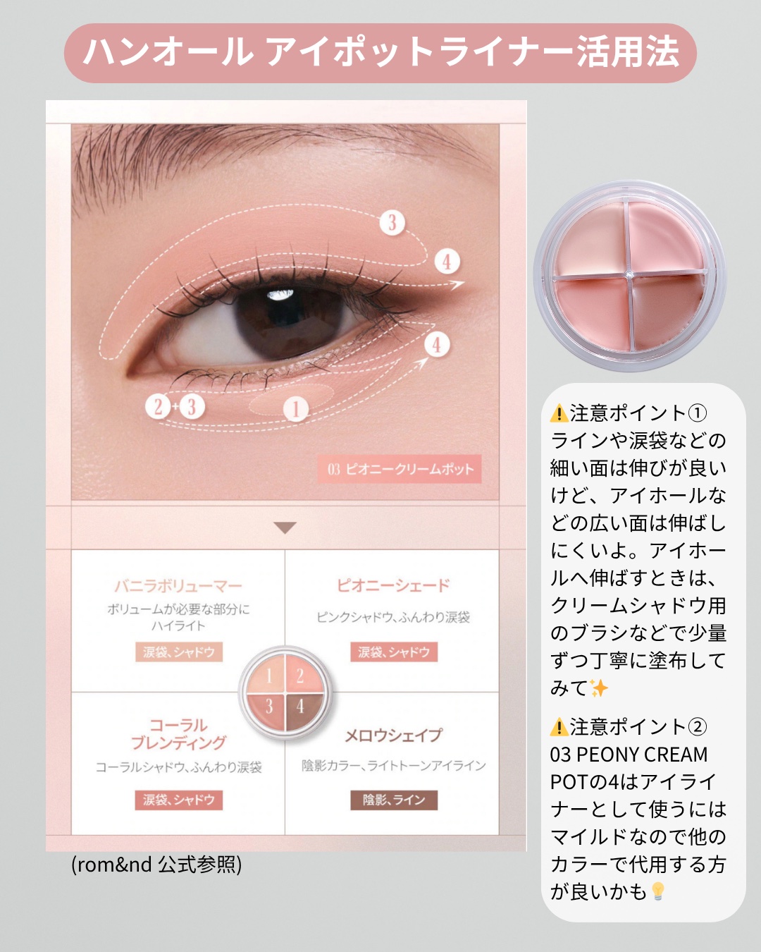 厳選4色♡目元拡張ポット!———-♡——————–♡———rom&ndハンオールアイポットライナー1,700円(Qoo10公式)———-♡——————–♡———話題の新作!厳選された4色で基本の陰影、目頭ライン、シャドウのライン、涙袋まで1つ...