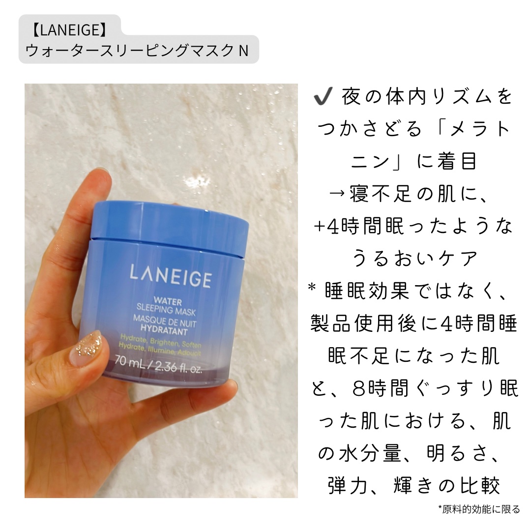 アラフォー混合肌Qoo10メガ割 おすすめスキンケア3選🔖🩵LANEIGE@laneige_jpウォータースリーピングマスクN+4時間眠ったような肌へ✨夜の体内リズムをつかさどる「メラトニン」に着目。寝不足の肌に、+4時間眠ったようなう...