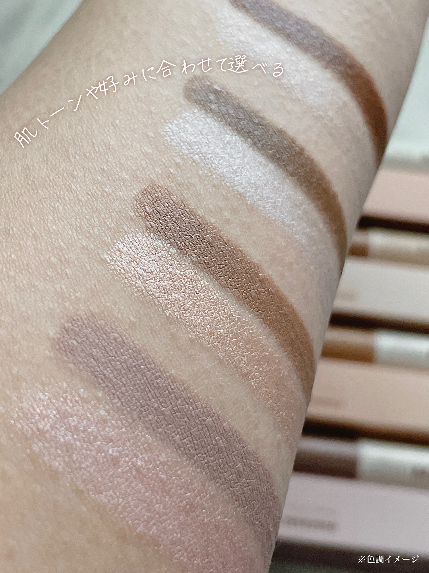 選べずに4色をタッチアップもせずに買ったので早速腕に出してみました。 353 リエゾンは塗った瞬間からラメっていました。 843 ディヴァインはもっと濃いです! 全部かわいいけど、100 ドリームズと323 ダズルがデイリー使いしやすそうかなぁと感じました。