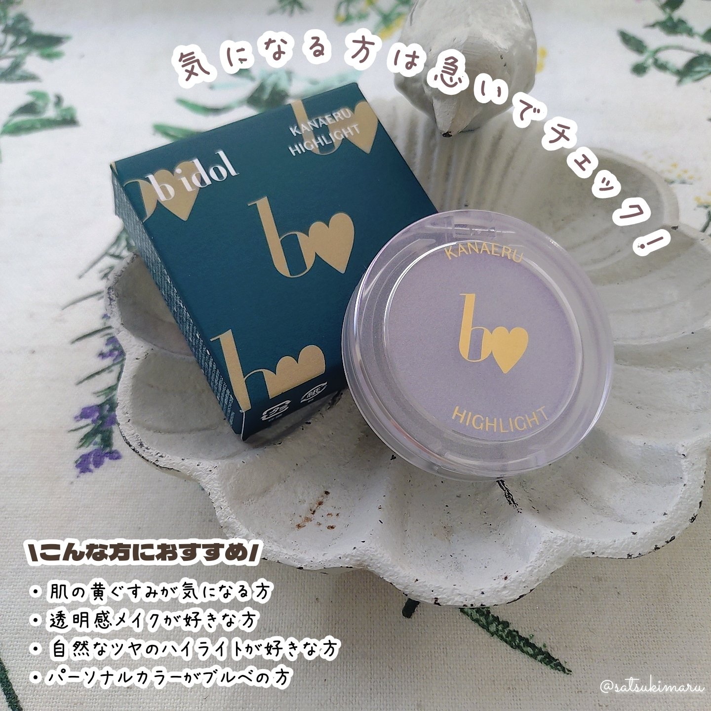 - b idolから新定番! 私にかける、魔法の光。 叶えるハイライト \立体感*血色*透明感/ 欲しいところにプラスする、シルキータッチなハイライト 骨格ベージュで顔全体をフラットになじませて、 鼻高ホワイトで鼻筋や額、高く見せたい所にポイント使い♪ ぷりぷりピンクはチーク使いでかわいく仕込む♡ お肌のことを考えた美容成分*配合なので使いやすい◎ マルチに使える3色展開!コンパクトなのでもち運びにもとっても便利。 *ティーツリー葉油、ヒアルロン酸Na、セラミドNP(全て保湿成分) <01 骨格ベージュ> 自然に溶け込む立体ベージュ <02 鼻高ホワイト> 透明感をひきあげるポイントマーブル <03 ぷりぷりピンク> やわらかな丸みを仕込む血色ピンク ※全てメイクアップ効果