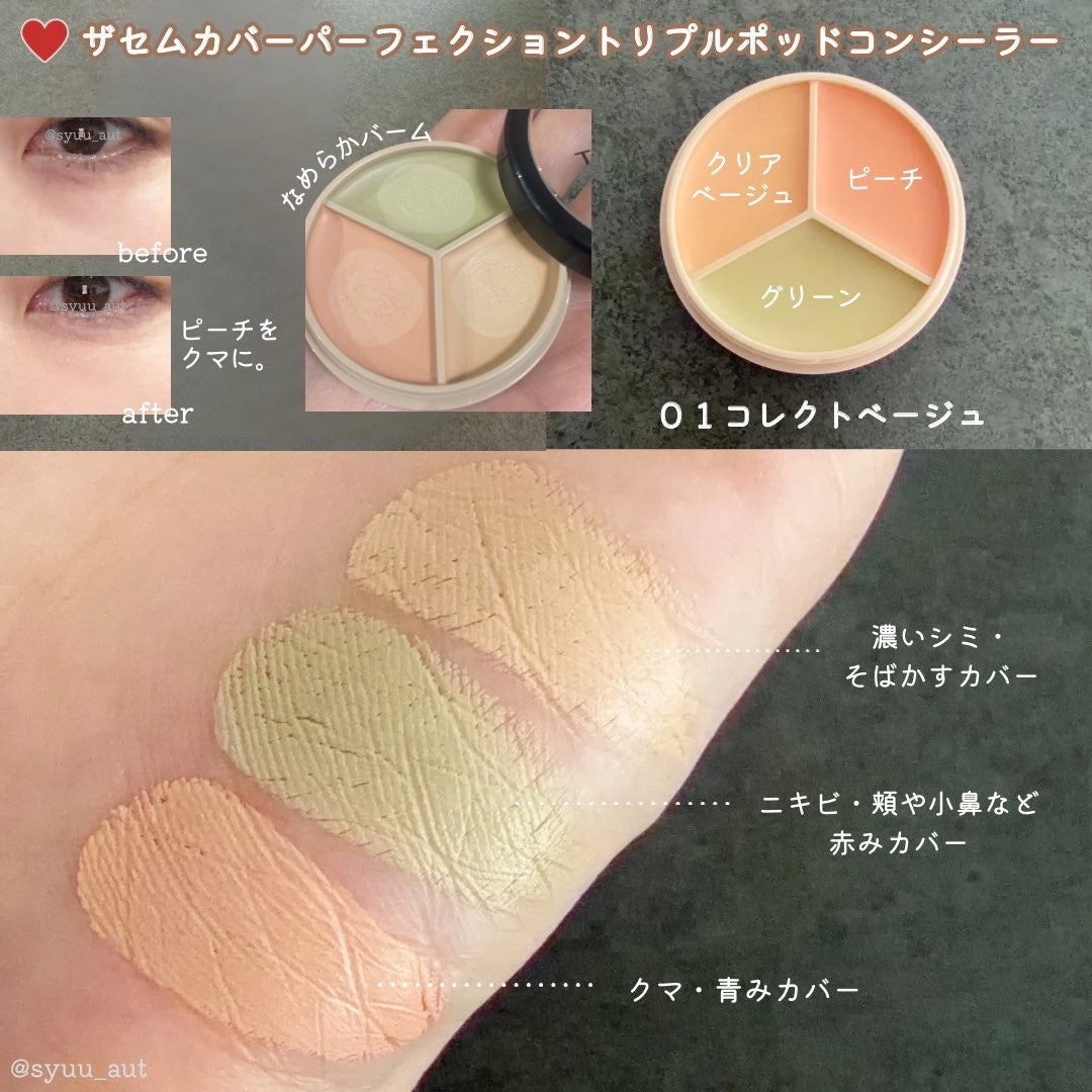 \3色コンシーラー/ザセムカバーパーフェクショントリプルポッドコンシーラー01コレクトベージュシミ・クマ・トーンの悩みを解決してくれる🥹🫧バームタイプで肌に密着!気になってたクマが隠れた😆🌼クリアベージュ↳濃いシミ・そばかすカバー🌼グリーン↳...