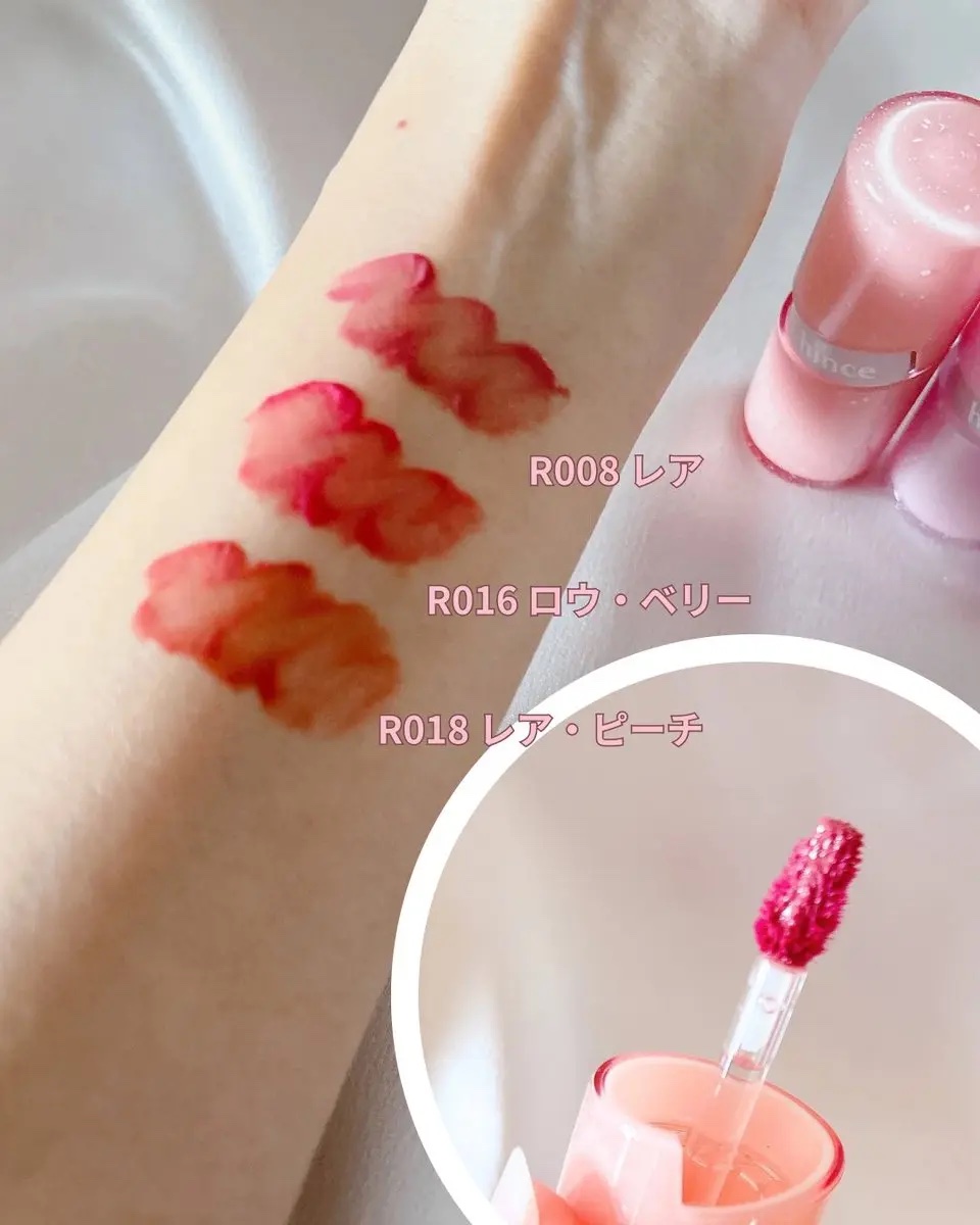 - <R001 ベア> 水、ジフェニルジメチコン、オクチルドデカノール、ビスジグリセリルポリアシルアジペート-2、リンゴ酸ジイソステアリル、トリメチルシロキシフェニルジメチコン、水添ポリイソブテン、ジグリセリン、ポリソルベート60、BG、セチルPEG/PPG-10/1ジメチコン、1,2-ヘキサンジオール、ペンチレングリコール、(アクリル酸ヒドロキシエチル/アクリロイルジメチルタウリンNa)コポリマー、セテアレス-20、スクワラン、フェノキシエタノール、酸化チタン、香料、エチルヘキシルグリセリン、黄5、赤227、イソステアリン酸ソルビタン、水酸化Al、ポリアクリル酸アンモニウム、酢酸トコフェロール、黄4、青1、ヒアルロン酸Na、(アルギニン/リシン)ポリペプチド、加水分解ヒアルロン酸、トコフェロール、アセチルヒアルロン酸Na、ソルビン酸 <R002 ロウローズ> 水、ジフェニルジメチコン、オクチルドデカノール、ビスジグリセリルポリアシルアジペート-2、リンゴ酸ジイソステアリル、トリメチルシロキシフェニルジメチコン、水添ポリイソブテン、ジグリセリン、ポリソルベート60、BG、セチルPEG/PPG-10/1ジメチコン、1,2-ヘキサンジオール、ペンチレングリコール、(アクリル酸ヒドロキシエチル/アクリロイルジメチルタウリンNa)コポリマー、セテアレス-20、スクワラン、フェノキシエタノール、酸化チタン、香料、エチルヘキシルグリセリン、黄5、赤227、イソステアリン酸ソルビタン、酢酸トコフェロール、水酸化Al、ポリアクリル酸アンモニウム、ヒアルロン酸Na、青1、加水分解ヒアルロン酸、(アルギニン/リシン)ポリペプチド、トコフェロール、アセチルヒアルロン酸Na、ソルビン酸 <R003 ロウプリコット> 水、ジフェニルジメチコン、オクチルドデカノール、ビスジグリセリルポリアシルアジペート-2、リンゴ酸ジイソステアリル、トリメチルシロキシフェニルジメチコン、水添ポリイソブテン、ジグリセリン、ポリソルベート60、BG、セチルPEG/PPG-10/1ジメチコン、1,2-ヘキサンジオール、ペンチレングリコール、(アクリル酸ヒドロキシエチル/アクリロイルジメチルタウリンNa)コポリマー、セテアレス-20、スクワラン、フェノキシエタノール、香料、エチルヘキシルグリセリン、酸化チタン、黄5、イソステアリン酸ソルビタン、赤227、酢酸トコフェロール、ヒアルロン酸Na、水酸化Al、ポリアクリル酸アンモニウム、加水分解ヒアルロン酸、青1、(アルギニン/リシン)ポリペプチド、トコフェロール、アセチルヒアルロン酸Na、ソルビン酸 <R004 フィーバー> 水、ジフェニルジメチコン、オクチルドデカノール、リンゴ酸ジイソステアリル、ビスジグリセリルポリアシルアジペート-2、トリメチルシロキシフェニルジメチコン、水添ポリイソブテン、ジグリセリン、ポリソルベート60、BG、セチルPEG/PPG-10/1ジメチコン、1,2-ヘキサンジオール、ペンチレングリコール、(アクリル酸ヒドロキシエチル/アクリロイルジメチルタウリンNa)コポリマー、セテアレス-20、スクワラン、フェノキシエタノール、香料、エチルヘキシルグリセリン、黄5、赤227、イソステアリン酸ソルビタン、酢酸トコフェロール、ヒアルロン酸Na、加水分解ヒアルロン酸、(アルギニン/リシン)ポリペプチド、トコフェロール、アセチルヒアルロン酸Na、ソルビン酸 <R005 ハイビスカス> 水、ジフェニルジメチコン、オクチルドデカノール、ビスジグリセリルポリアシルアジペート-2、リンゴ酸ジイソステアリル、トリメチルシロキシフェニルジメチコン、水添ポリイソブテン、ジグリセリン、ポリソルベート60、BG、セチルPEG/PPG-10/1ジメチコン、1,2-ヘキサンジオール、ペンチレングリコール、アクリル酸ヒドロキシエチル/アクリロイルジメチルタウリンNa)コポリマー、セテアレス-20、スクワラン、フェノキシエタノール、香料、エチルヘキシルグリセリン、赤227、黄5、イソステアリン酸ソルビタン、赤104(1)、酢酸トコフェロール、ヒアルロン酸Na、加水分解ヒアルロン酸、(アルギニン/リシン)ポリペプチド、トコフェロール、アセチルヒアルロン酸Na、ソルビン酸 <R006 ロウグレープ> 水、ジフェニルジメチコン、ビスジグリセリルポリアシルアジペート-2、リンゴ酸ジイソステアリル、オクチルドデカノール、トリメチルシロキシフェニルジメチコン、水添ポリイソブテン、ジグリセリン、ポリソルベート60、BG、セチルPEG/PPG-10/1ジメチコン、1,2-ヘキサンジオール、ペンチレングリコール、(アクリル酸ヒドロキシエチル/アクリロイルジメチルタウリンNa)コポリマー、セテアレス-20、スクワラン、酸化チタン、フェノキシエタノール、香料、エチルヘキシルグリセリン、黄5、赤227、イソステアリン酸ソルビタン、水酸化Al、ポリアクリル酸アンモニウム、酢酸トコフェロール、ヒアルロン酸Na、青1、加水分解ヒアルロン酸、(アルギニン/リシン)ポリペプチド、トコフェロール、アセチルヒアルロン酸Na、ソルビン酸 <R007 チル> 水、ジフェニルジメチコン、オクチルドデカノール、ビスジ