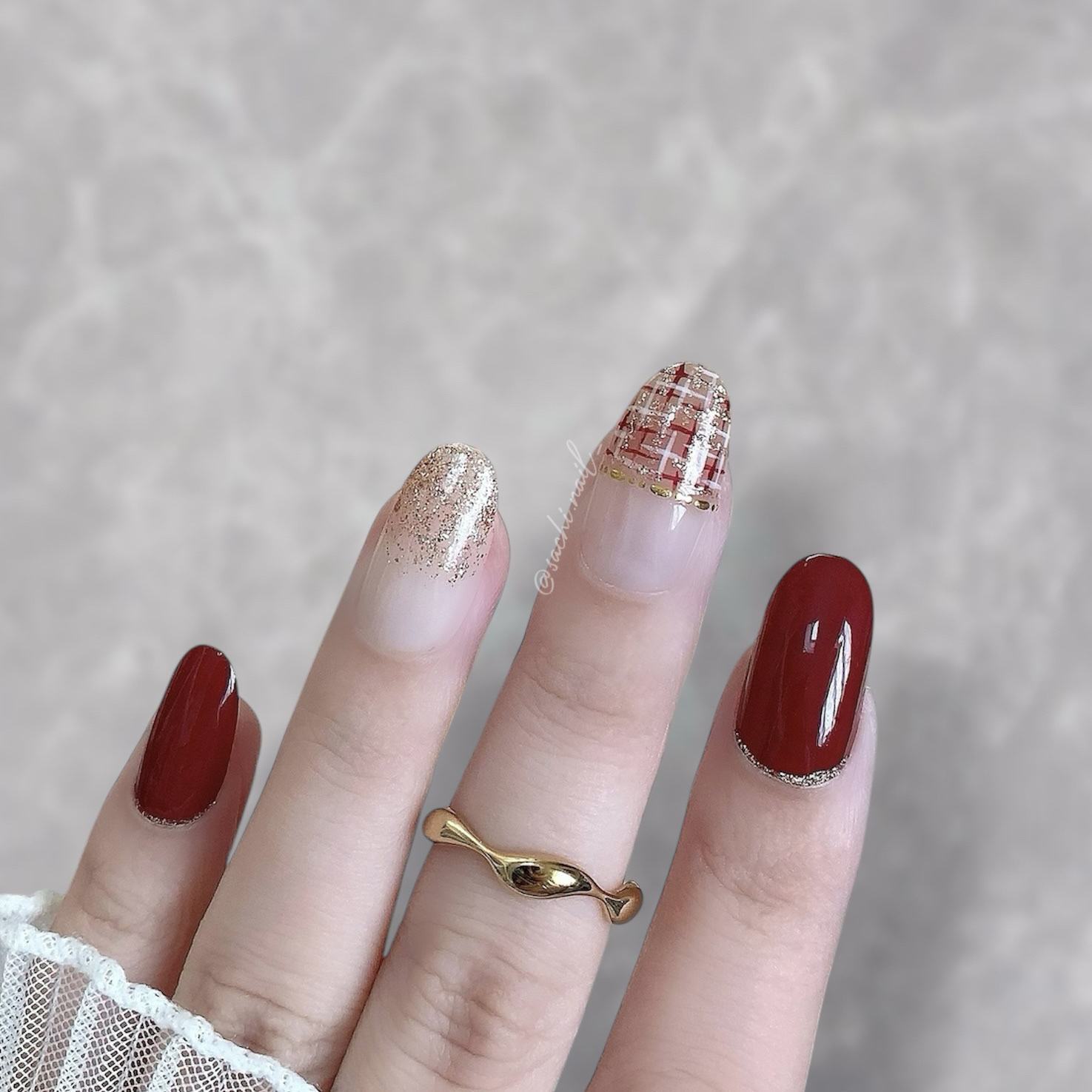 ワンカラーでも指ごとに色を変えるだけでオシャレに見えます💕 画像のようにゴールドラインとストーンを少し足すだけで華やかさがアップ🥰 何度かご紹介したことのあるスポンジで作るグラデーションです✨ スポンジを使うことで境目が綺麗に馴染んでくれます💕 アルミホイルの上でブラウンとトップコートを1:1くらいで混ぜたものを、トップコートのハケに取って3箇所に塗るだけ👌 事前に混ぜたものを塗ることで、爪の上でぼかすより簡単に出来ます💕 ベースカラーが乾く前に点置きしてぼかすことで綺麗にぼかせます✨ スピードが大事なので、使うポリッシュのキャップは全て開けておきましょう😊 天然石のラインはガタガタの方がより天然石っぽく見えるので、ラインを描くのが苦手な方でも大丈夫🙆♀️ 難しそうに見えて、やってみると意外と簡単に出来ます♡