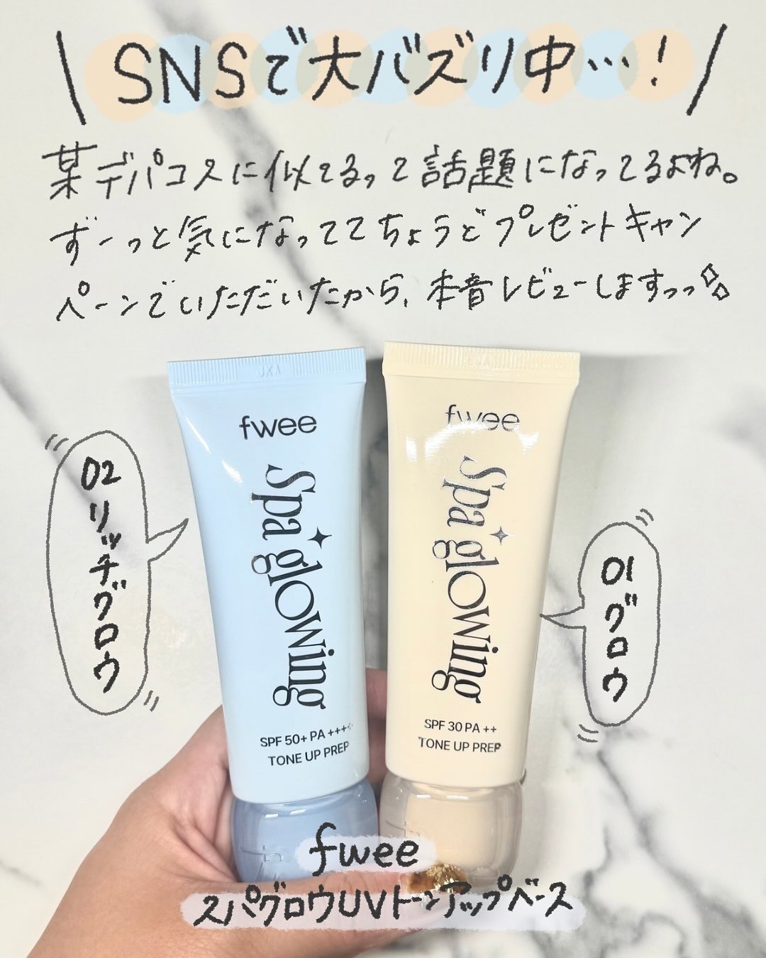 最近流行りの #fweeの下地正直レビューツヤ肌命!の方には02がおすすめ🩵私は乾燥肌だけどカバー力も欲しいから、01と02を手の甲でミックスさせてから使うのにハマってる😆とにかく仕上がりが綺麗✨自然にトーンアップ🌸次に塗るファンデーションの...