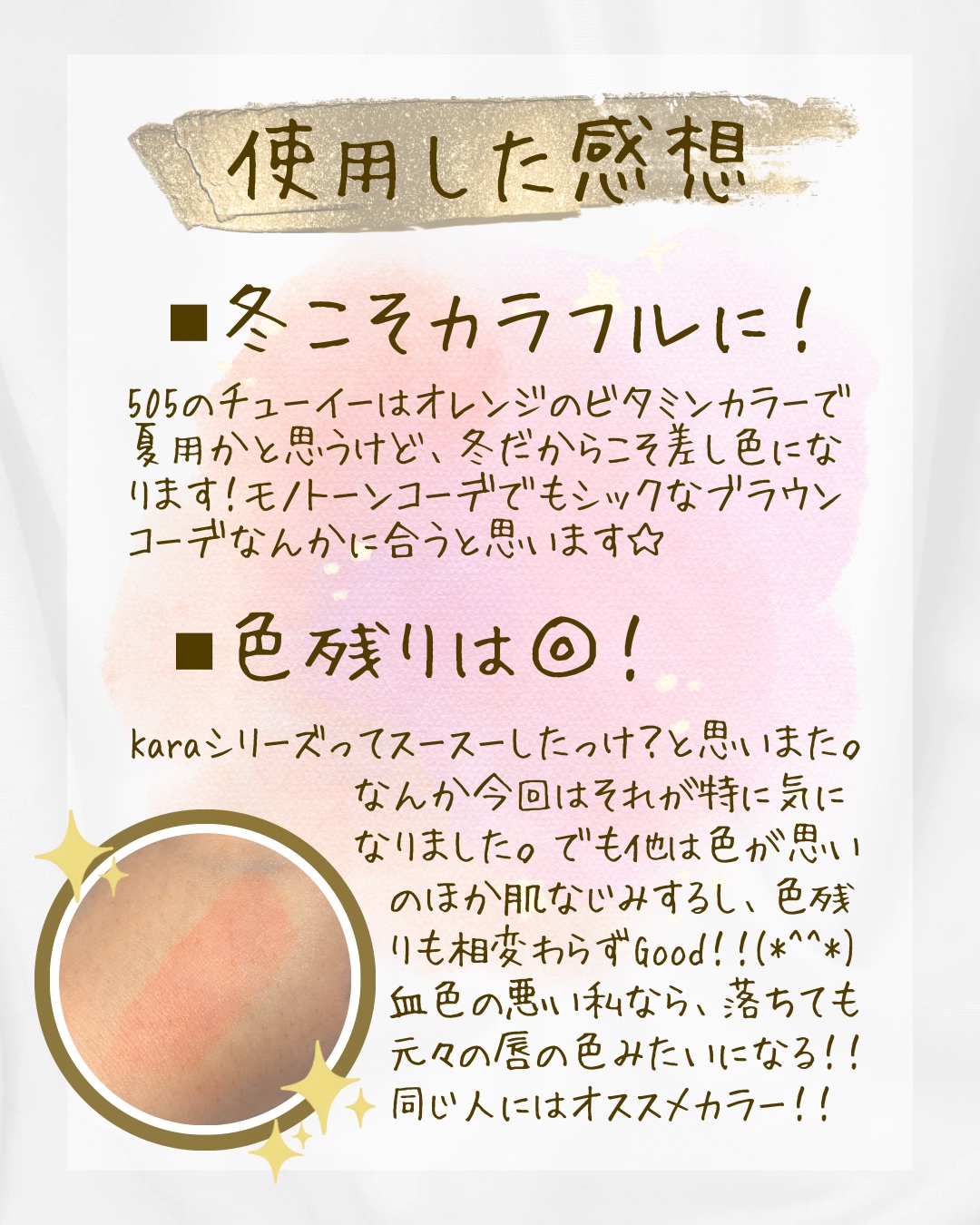 | 口紅・グロス・リップライナーランキング第21位 | グラデーションリップのベースとしても使いやすいですし、重ね塗りして少し発色を良くしても可愛かったです。 | 詳細を見る | |