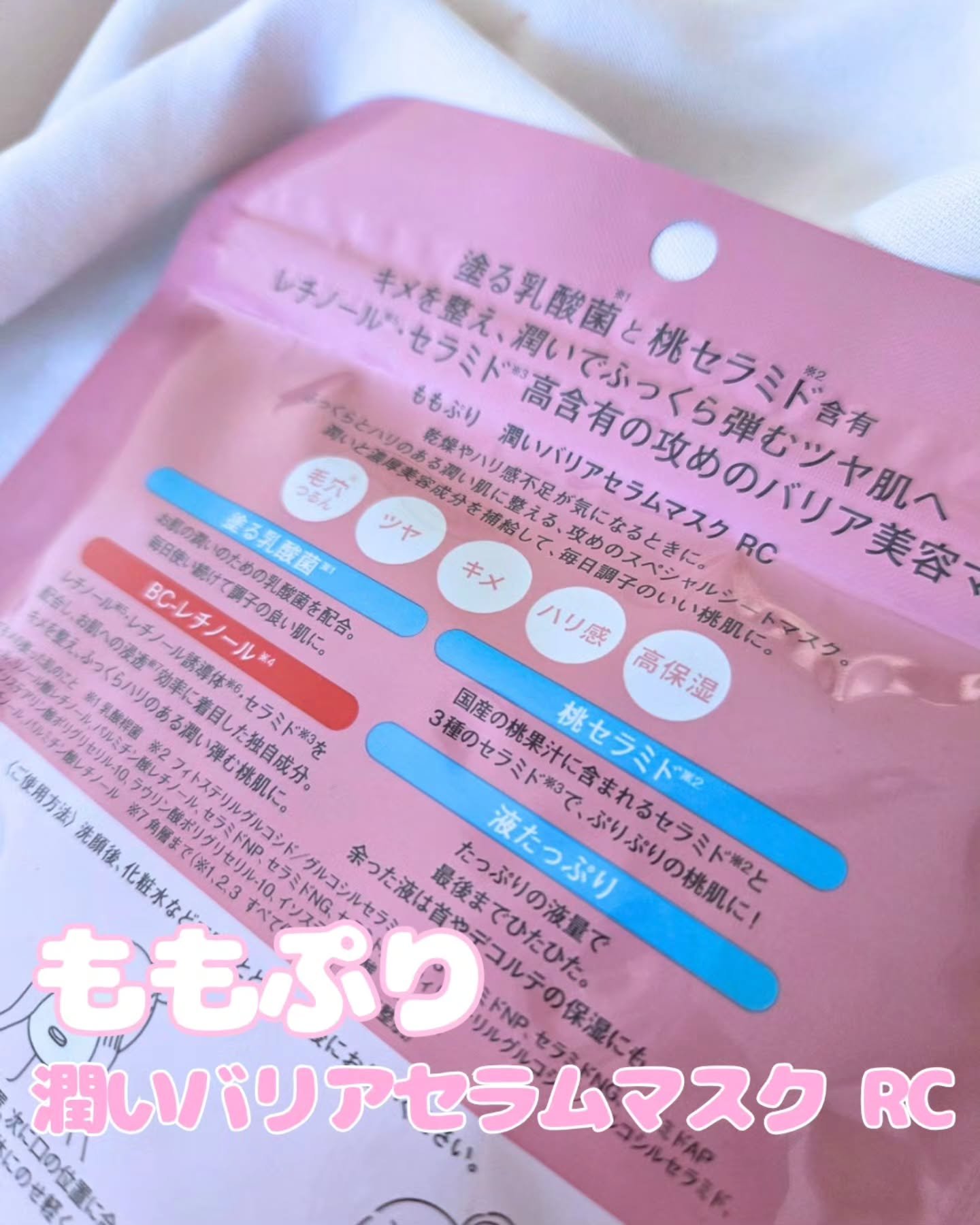 ももぷり『ももぷり潤いバリアセラムマスクRC』𓈒𓂂𓂃◌𓈒𓐍\ふっくら桃弾肌に導く/ももぷりの新美容液マスク!!レチノール*1・セラミド*2高含有の攻めのバリア美容マスク✨毎日調子の良い、ぷりぷりの桃肌に導く美容成分を配合*1整肌*2セラミドN...