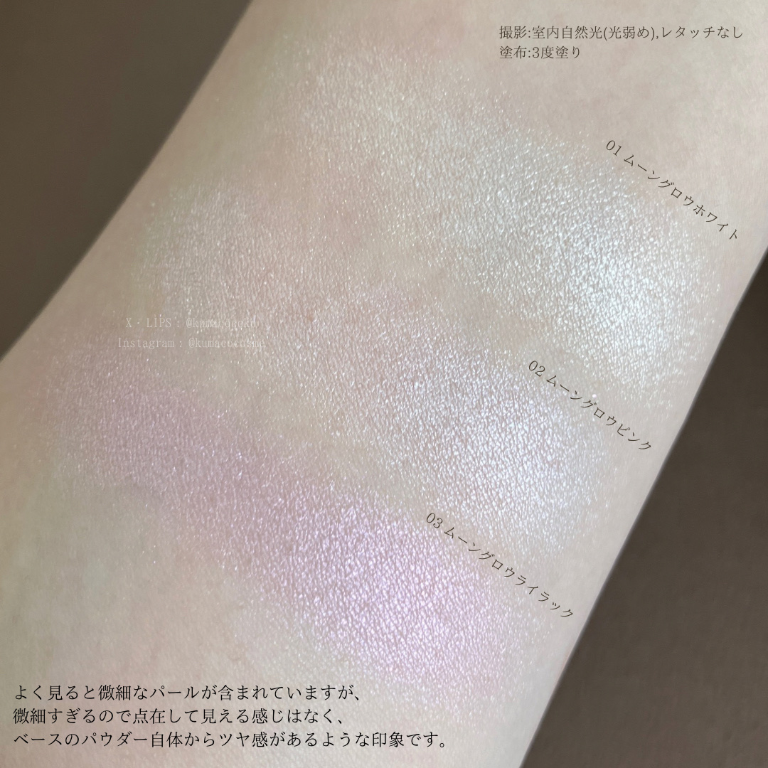- <01 ムーングロウホワイト> マイカ、酸化チタン、合成フルオロフロゴパイト、リンゴ酸ジイソステアリル、(ジメチコン/ビニルジメチコン)クロスポリマー、ステアロイルオキシステアリン酸オクチルドデシル、ジメチコン、窒化ホウ素、ポリメチルシルセスキオキサン、(ビニルジメチコン/メチコンシルセスキオキサン)クロスポリマー、ステアリン酸亜鉛、BG、カプリリルグリコール、エチルヘキサン酸セチル、パルミチン酸イソプロピル、コメヌカ油、ステアリン酸グリセリル、安息香酸アルキル(C12-15)、セテアリルアルコール、トリカプリン、フェノキシエタノール、シリカ、酸化スズ、ステアリン酸PEG-100、クロルフェネシン、ベンゾトリアゾリルドデシルp-クレゾール、PEG-40ヒマシ油、BHT、キサンタンガム、ブチルフタルイミド、サリチル酸エチルヘキシル、t-ブチルメトキシジベンゾイルメタン、水、酸化鉄、セテアリル硫酸Na、EDTA-2Na、イソプロピルフタルイミド、ビサボロール、グリセリン、水酸化K、マルトデキストリン、アロエベラ液汁、アロエベラ葉エキス、アルガニアスピノサ核油、シア脂、オリーブ果実油、ホホバ種子油、オクチルドデカノール、ナイアシンアミド、クロフサスグリ種子油、アセチルグルコサミン、コウゾ根エキス、セテアレス-25、ツバキ葉エキス、チャ葉エキス、ツボクサエキス、ヒマワリ種子油不けん化物、マグワ樹皮エキス、リンゴ果実エキス、セタノール、ベヘン酸、カプロオイルフィトスフィンゴシン、カプロオイルスフィンゴシン、フウセンカズラ花/葉/つるエキス、セラミドAP、セラミドEOP、セラミドEOS、セラミドNP、セラミドNS、コレステロール、エチルヘキシルグリセリン、ガラクトアラビナン、オレイン酸グリセリル、ヒマワリ種子油、ハチミツエキス、レシチン、ローズマリー葉エキス、ローヤルゼリーエキス、マツタケエキス