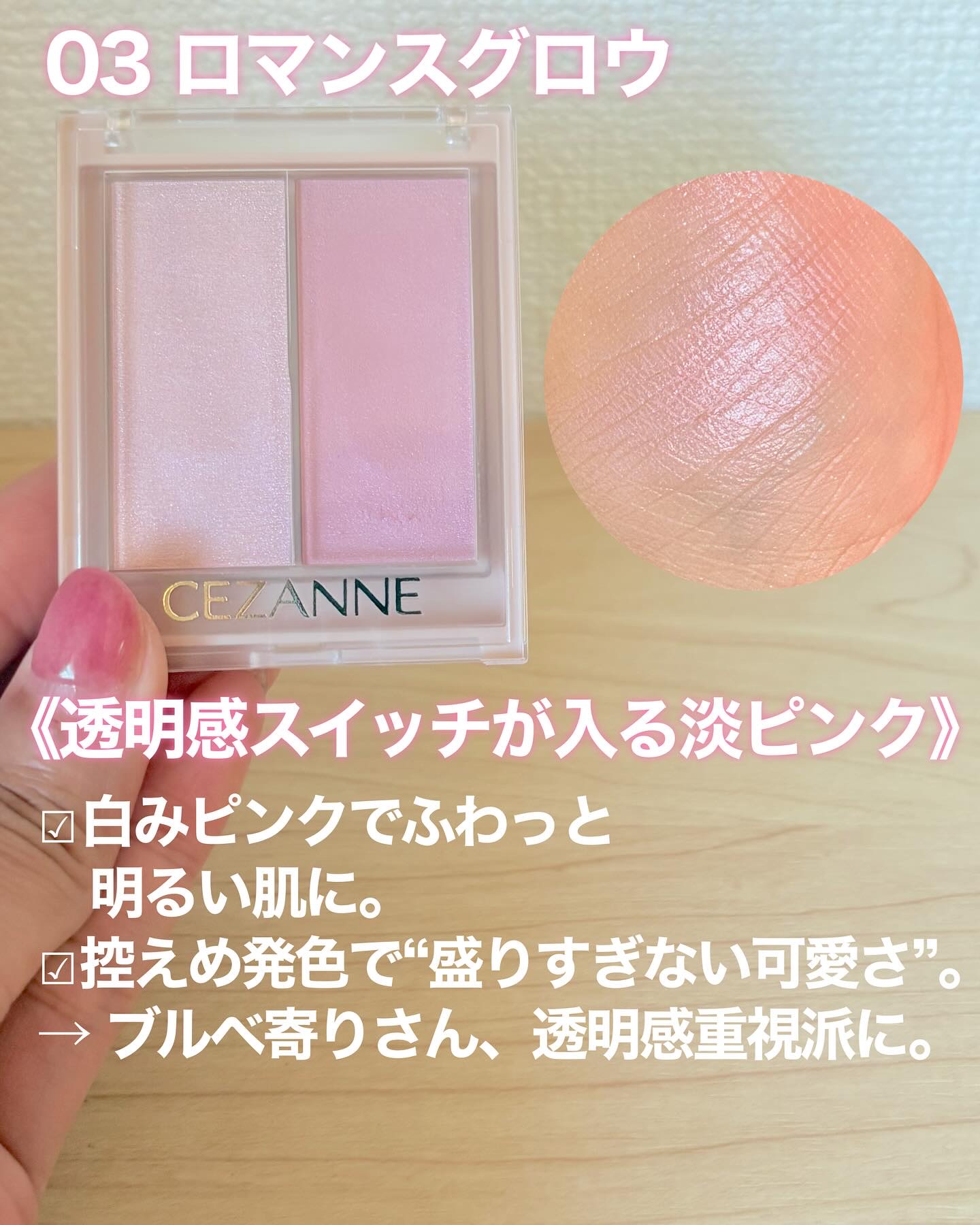 セザンヌから春の新作コスメ🌼 マット3カラーとパール1カラーが一つになったパレットは混ぜ方次第でマットチークにも艶チークに♡ ササッと塗るだけできれいなツヤが〜😍 カラバリは全2色。 私はイエベ春なので01がお気に入りですが、02もほんのりのせると透明感が出て良い感じでした🫶