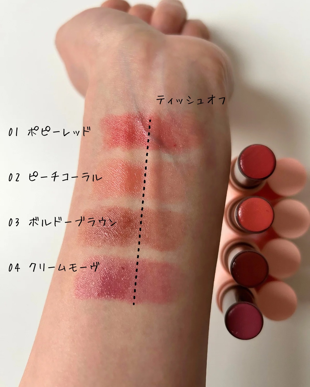 💄Kirei&co.(キレイアンドコー)グロウインリップ01ポピーレッド02ピーチコーラル03ボルドーブラウン04クリームモーヴ各660円(税込)💄こんなに安くていいの⁉︎コスパ最強過ぎるリップ✨私は01ポピーレッドが一番お気に入り😊💄オイル...