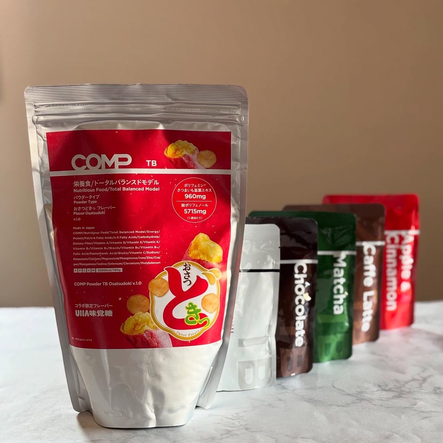 - 完全食*をコンセプトとして、厚生労働省「日本人の食事摂取基準(2020年版)」を参考に、三大栄養素「Protein(たんぱく質)」「Fat(脂質)」「Carbohydrate(炭水化物)」とビタミン・ミネラルをバランスよく含んだCOMPのトータルバランスドモデル(TB)パウダータイプ。 「さつまいものおいしさ、そのまま」でお馴染み、UHA味覚糖が誇る『おさつどきっ』とのコラボレーションが実現しました。『COMP』独自の栄養設計・品質に加え、『おさつどきっ』の美味しさをプラス。 三大栄養素(たんぱく質・脂質・炭水化物)・ビタミン・ミネラルなどの栄養素をトータルでバランスで良く摂取できるだけでなく、1袋(760g)あたり総ポリフェノール含有量 5,715mg、「ポリフェミン®さつまいも茎葉エキス」(ネオクロロゲン酸類を含むさつまいもならではのポリフェノール)を960mgもあわせて摂取できることが特徴です。