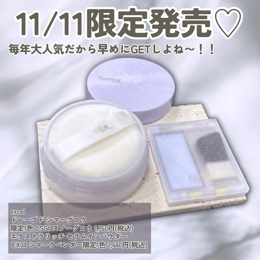 うるふわ美容液パウダーに限定「冬の透明感肌」登場♡———-♡——————–♡———エクセルエクストラリッチ セラムインパウダーEX04シマーラベンダー2,640円(税込)———-♡——————–♡———定番化した大人気のエクセルのパウダーに限...