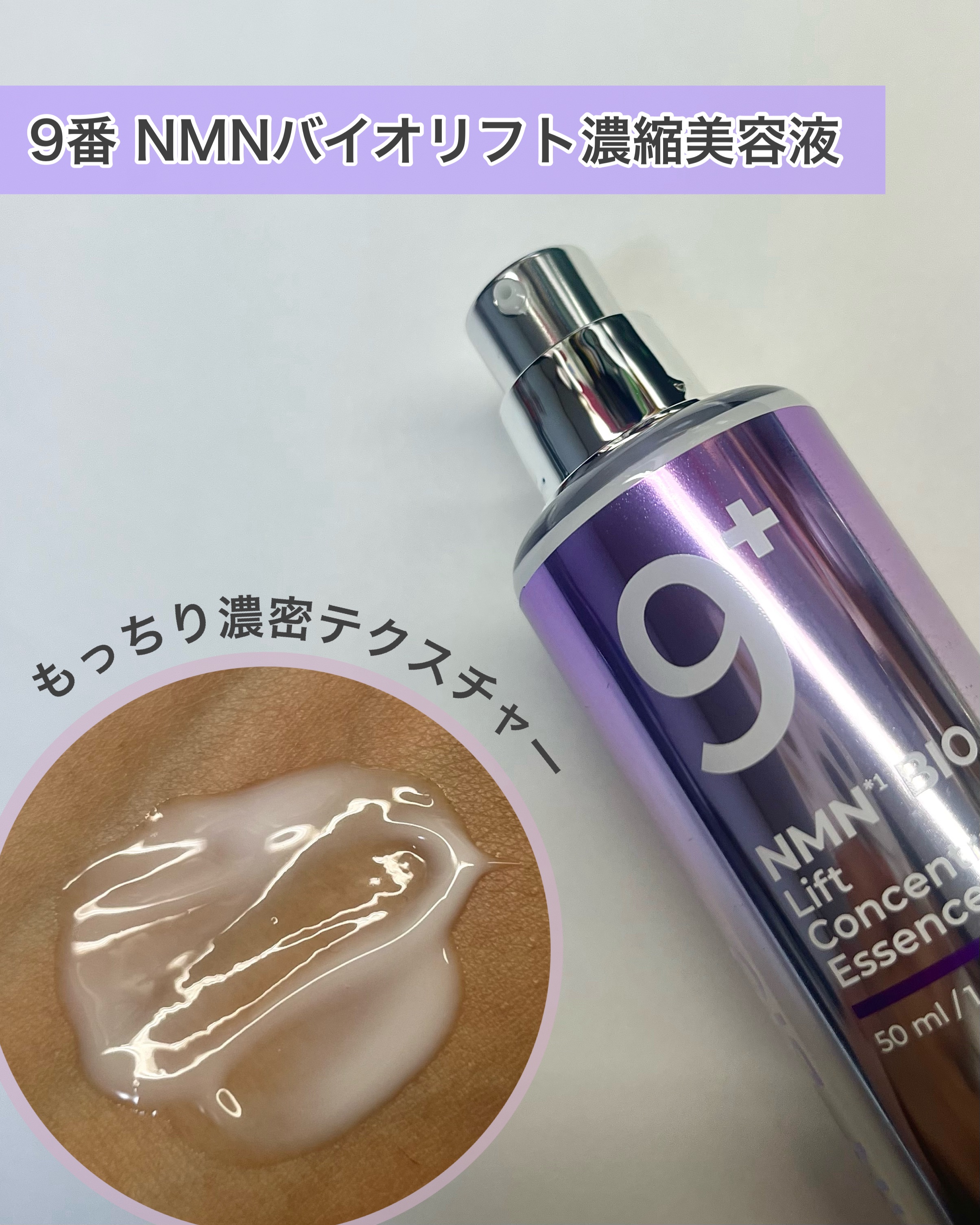 9番NMNバイオリフトラッピングマスクは上下にわかれたマスクになっていて、柔らかいもちっとしたシートが肌に密着してくれます。 下半部のシートは下から引き上げ耳に引っかけれるので引き上げられてる感はあり、 9番NMNバイオリフト濃縮美容液 50mlは浸透力がよい美容液でシワに入り込みハリを与えてくれるみたいです。